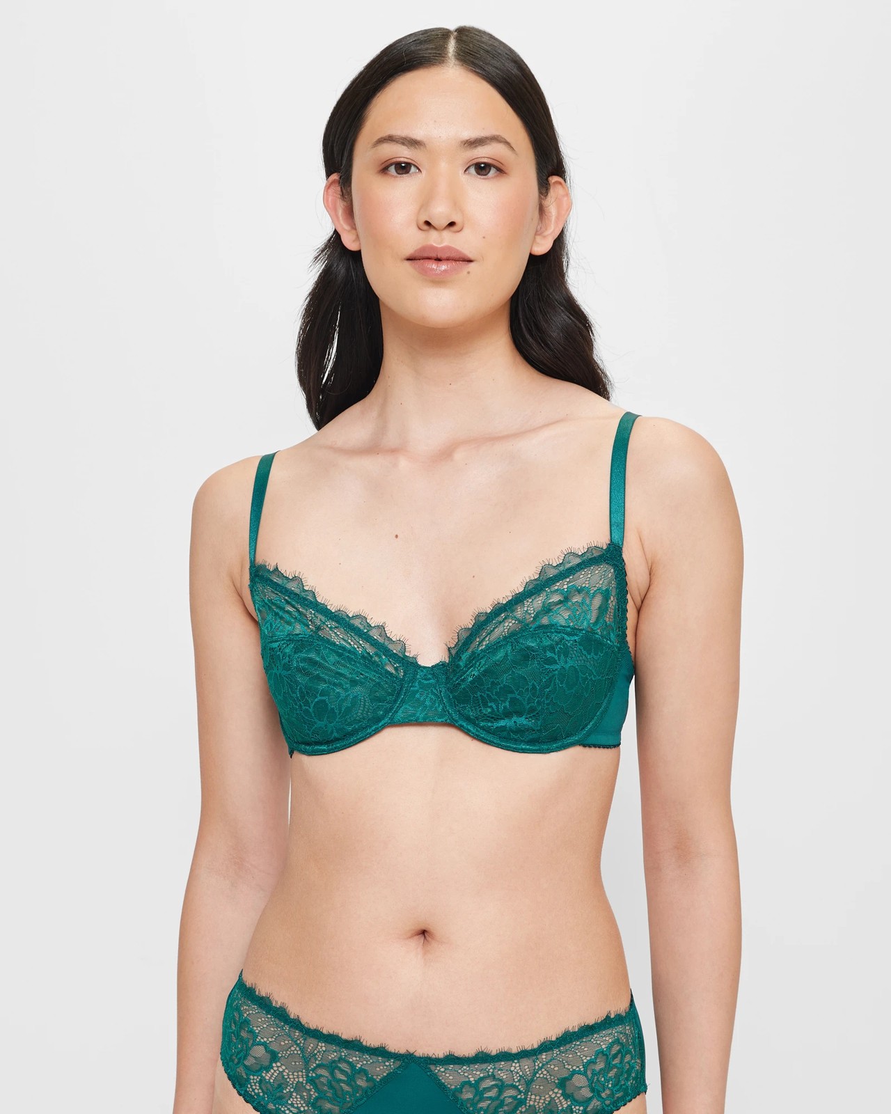 Experience ultimate comfort and style with our Soft Cup Underwire Lace Bra. Made from a luxurious nylon-rich fabric, this bra features a stretchy design for a perfect fit and a soft, satin-like feel against your skin. The playful deep teal colour adds a touch of sophistication to your lingerie collection. The balconette design and sweetheart neckline provide a flattering shape, while the thin adjustable shoulder straps ensure a comfortable and secure fit. With soft lace cups and full coverage, this bra offers both style and support. The scalloped edging around the hemline adds a feminine touch. Complete the look by pairing it with our matching briefs (sold separately). Upgrade your lingerie collection with this stunning bra today and feel confident and beautiful inside and out.