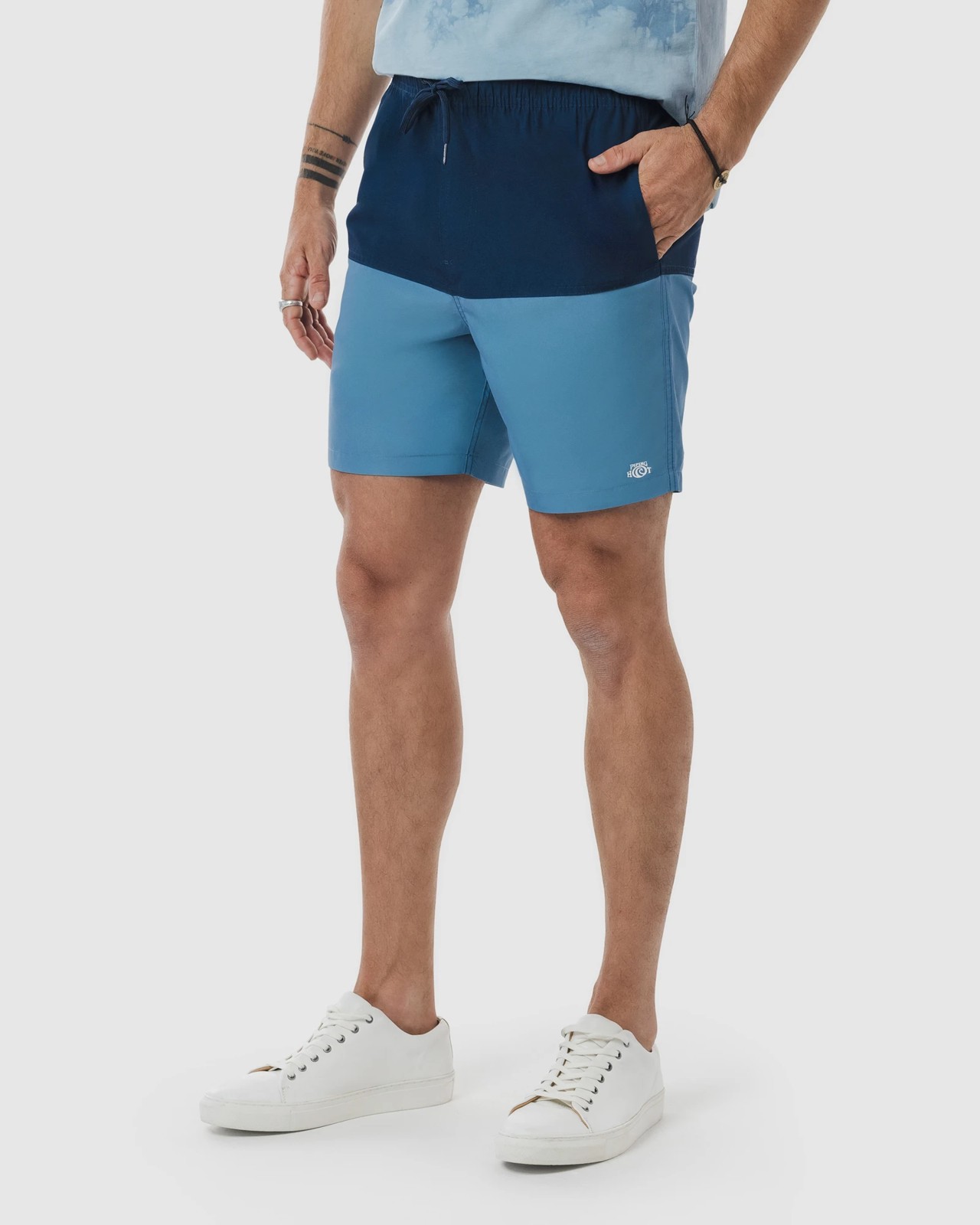 Easy wear volley shorts for the pool and the beach featuring blue and navy panelling. Featuring a comfortable elasticated waist and functional pockets.