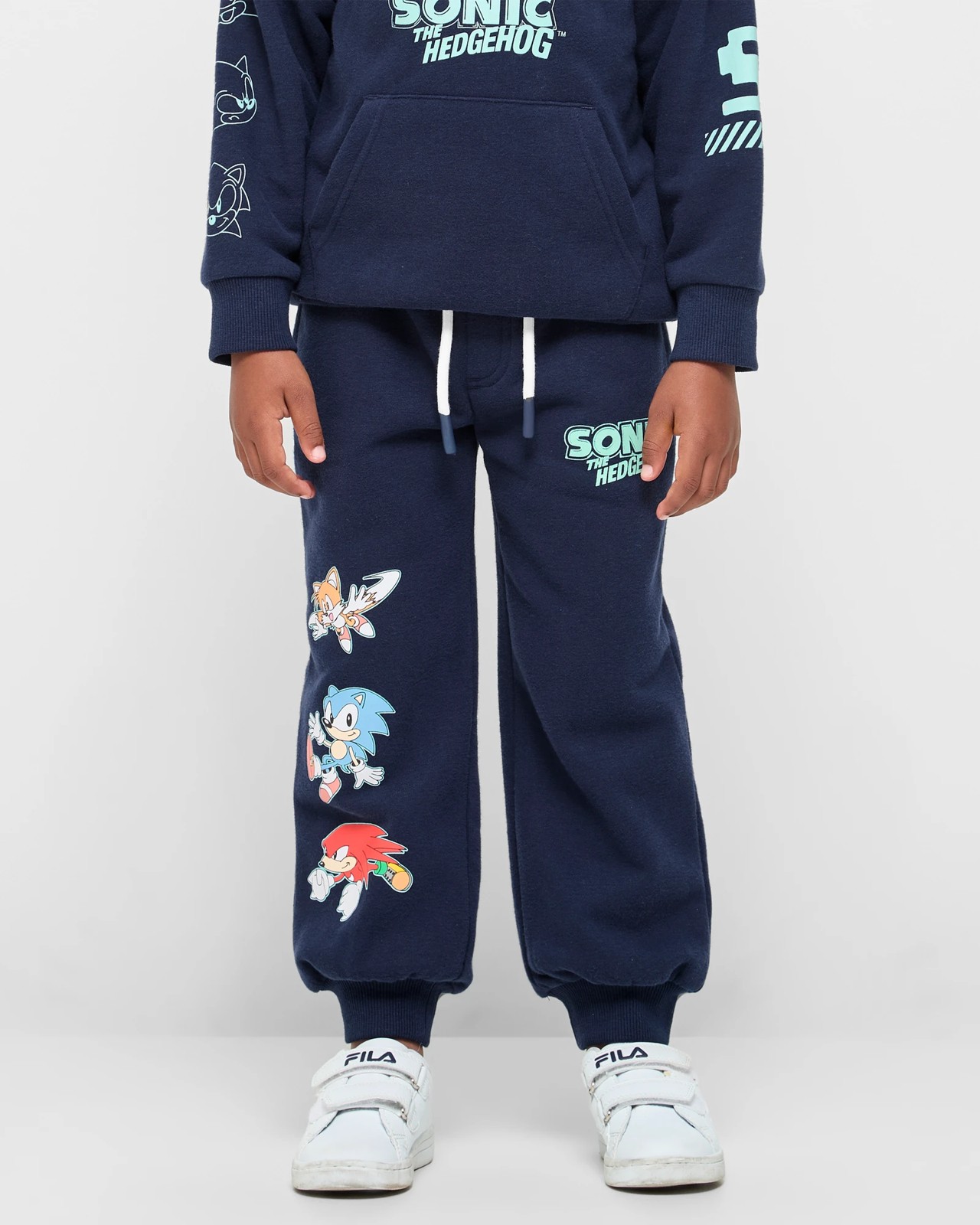 Dive into comfort and style with these Sonic the Hedgehog trackpants. Made from a soft cotton-poly blend, these navy blue trackpants offer a perfectly regular fit. They feature a ribbed elastic waistband with a drawcord for a snug, adjustable fit, and side seam pockets for practicality. The eye-catching Sonic print adds a playful touch, perfect for any young fan of the speedy hedgehog. Complete with ribbed cuffs and a cosy fleece lining, these trackpants are ideal for everyday adventures. Don't forget, a matching hoodie is available to complete the look. Grab yours today and let the fun begin!