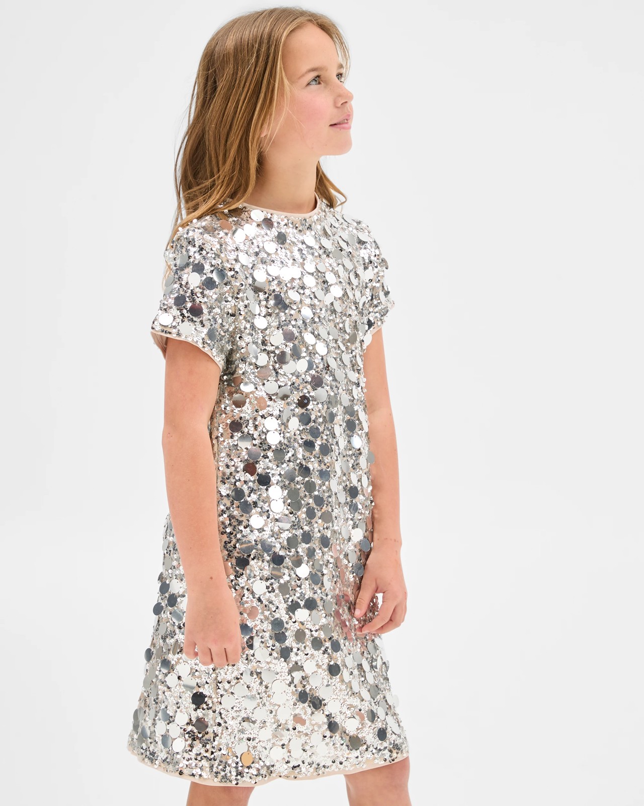 Capture the spotlight at your next big event with this beautiful sequin and beaded dress, specially made for girls who love to shine. Sparkling silver sequins give the dress a lively charm, while the smooth round neckline and soft short sleeves create a relaxed yet stylish fit. The full lining makes it gentle on the skin, perfect for hours of fun and celebration. With a neat button closure and split at the back, getting ready is a breeze. Make every moment memorable by choosing this charming dress for the special day.