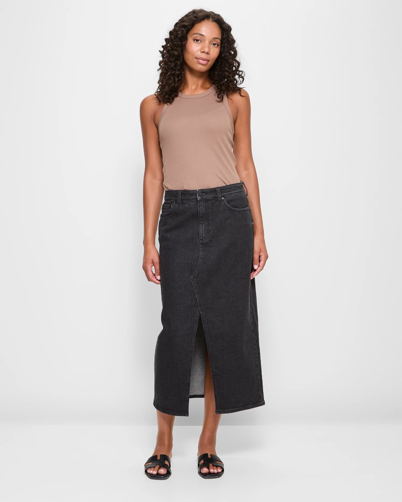 Discover the perfect blend of style and comfort with our Split Front A-Line Denim Maxi Skirt. Made from a cotton-rich fabric and featuring a hint of elastane, this skirt ensures a comfortable fit with every wear. It comes in a washed black shade with a structured waistband and belt loops, making it a timeless piece. The front split adds a modern touch, allowing easy movement, while the classic 5-pocket design adds practicality. Ideal for any occasion, this skirt is a must-have addition to your wardrobe.