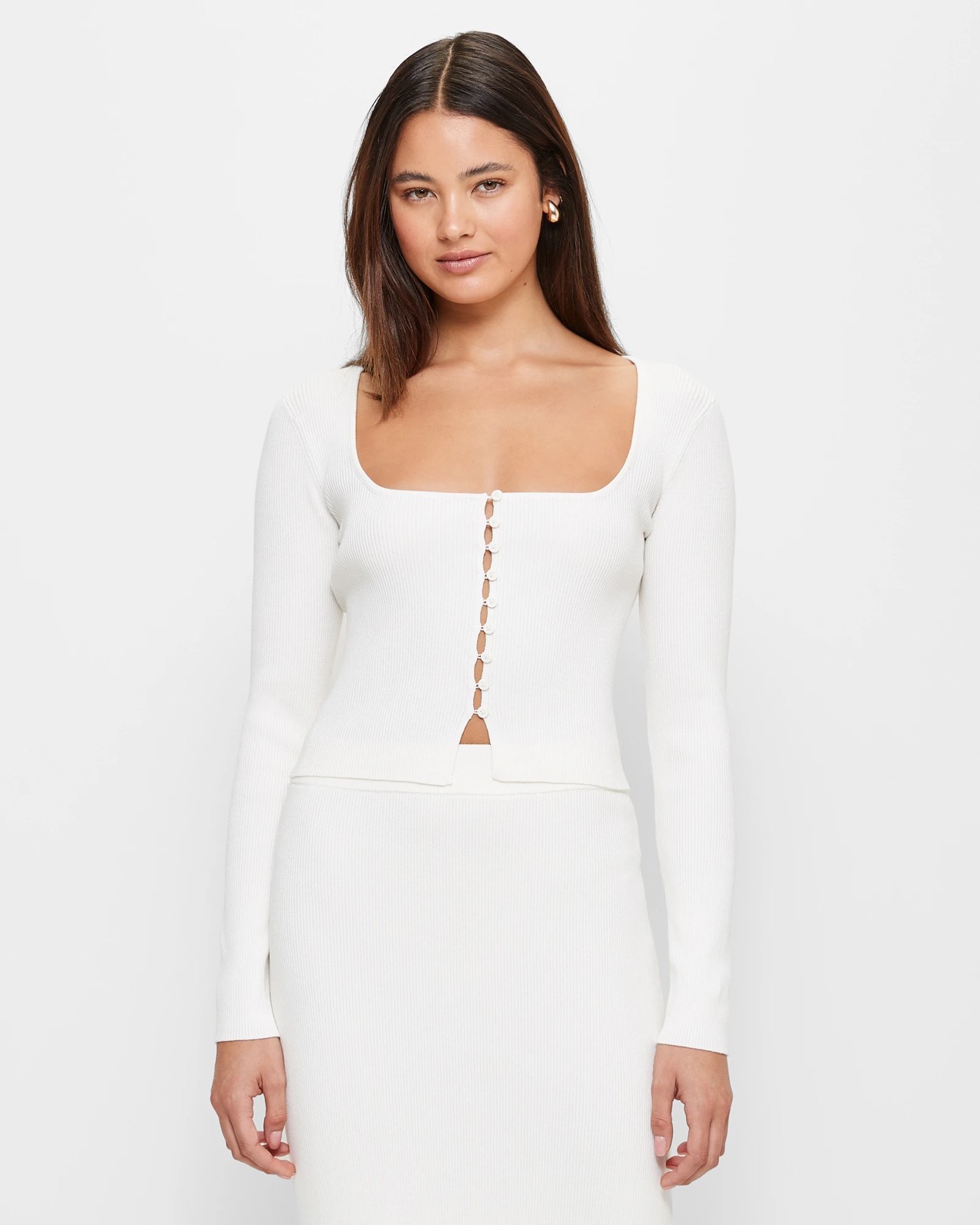 Introducing the Square Neck Button Front Cardigan from Lily Loves. This beautifully crafted cardigan is made from a soft blend of viscose and nylon. It features an all-over ribbed design for added texture and style. With a square neckline and button-through front, this cardigan is both trendy and elegant. The long sleeves and cropped length create a flattering silhouette, while the straight hemline adds a touch of sophistication. Whether you pair it with jeans for a casual look or dress it up for a night out, this cardigan is the perfect addition to your wardrobe. Add a touch of style and comfort to your outfit, get your Square Neck Button Front Cardigan today!