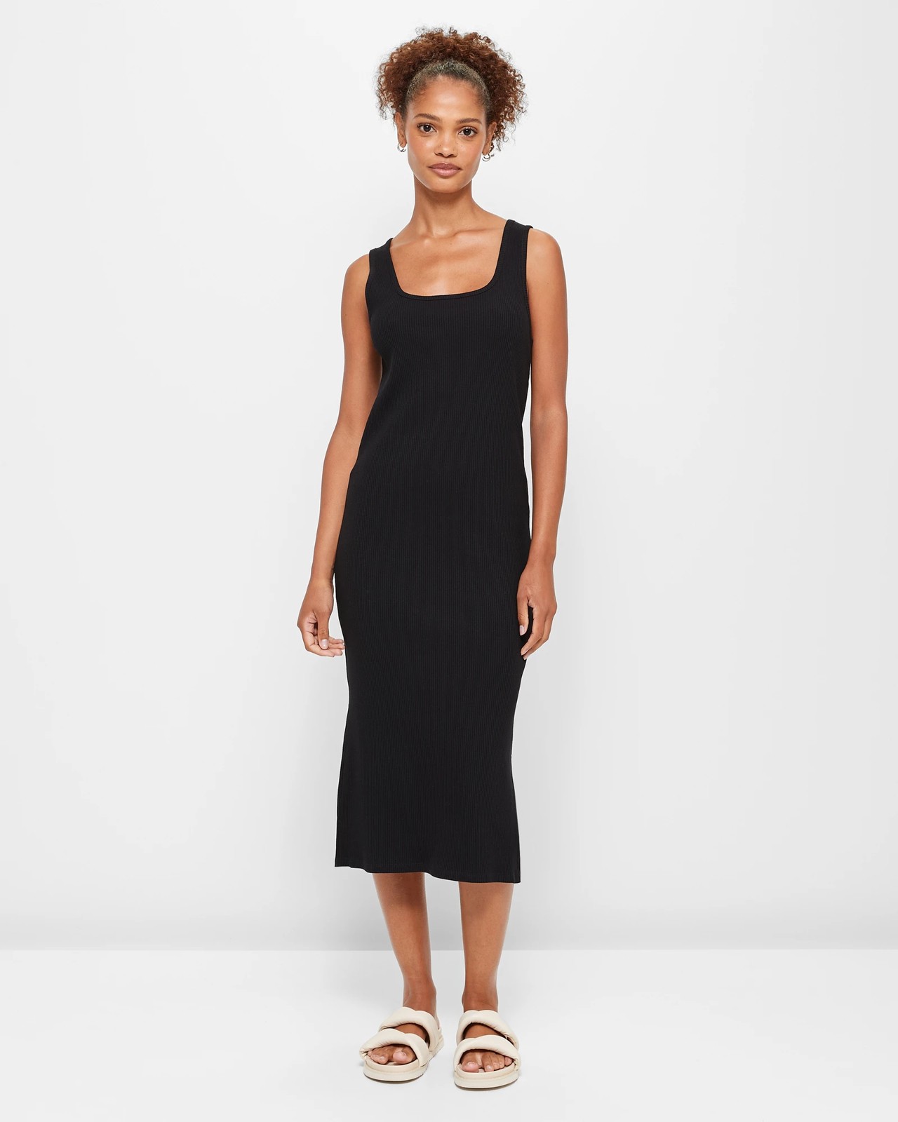 Introducing our Square Neck Rib Midi Dress, the perfect addition to your wardrobe. Made from a cotton/polyester blend, this dress offers both comfort and style. The all-over ribbed design adds a touch of texture, while the square neckline and thick shoulder straps create a modern and flattering silhouette. The midi length and straight cut make this dress versatile for any occasion. Whether you're heading to a brunch with friends or a night out on the town, this dress has got you covered. The straight hemline and side seam splits add an extra level of detail to the overall look. Don't miss out on this black beauty - add it to your cart now and experience the perfect blend of fashion and comfort.