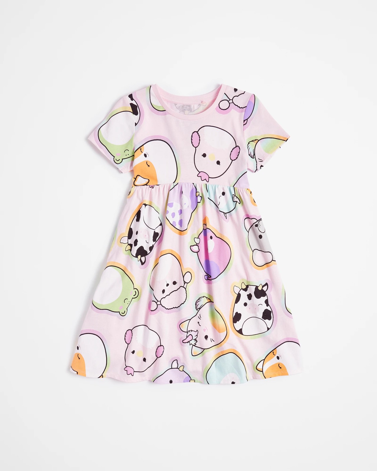 Introducing the adorable Squishmallows dress. This dress is crafted from a cotton-rich fabric and features a regular fit design with a pink all over Squishmallows print. It has ribbed crew neck, short sleeves, and a gathered elastic waistband for added comfort. The A-line fit makes this dress perfect for any occasion. Whether it’s twirling around the living room or attending a play date, this dress is sure to be the perfect addition to her wardrobe!