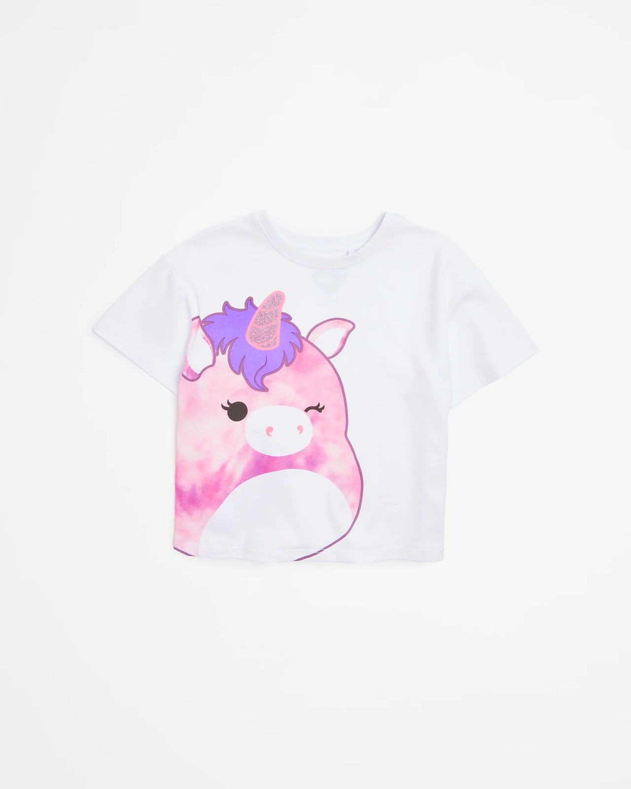 This cotton-rich t-shirt is perfect for any occasion! With a regular fit, ribbed crew neck and short sleeves, it features a large Squishmallow unicorn print with glitter accents to the chest and back. A straight hem completes the look. The perfect addition to any girl's wardrobe.