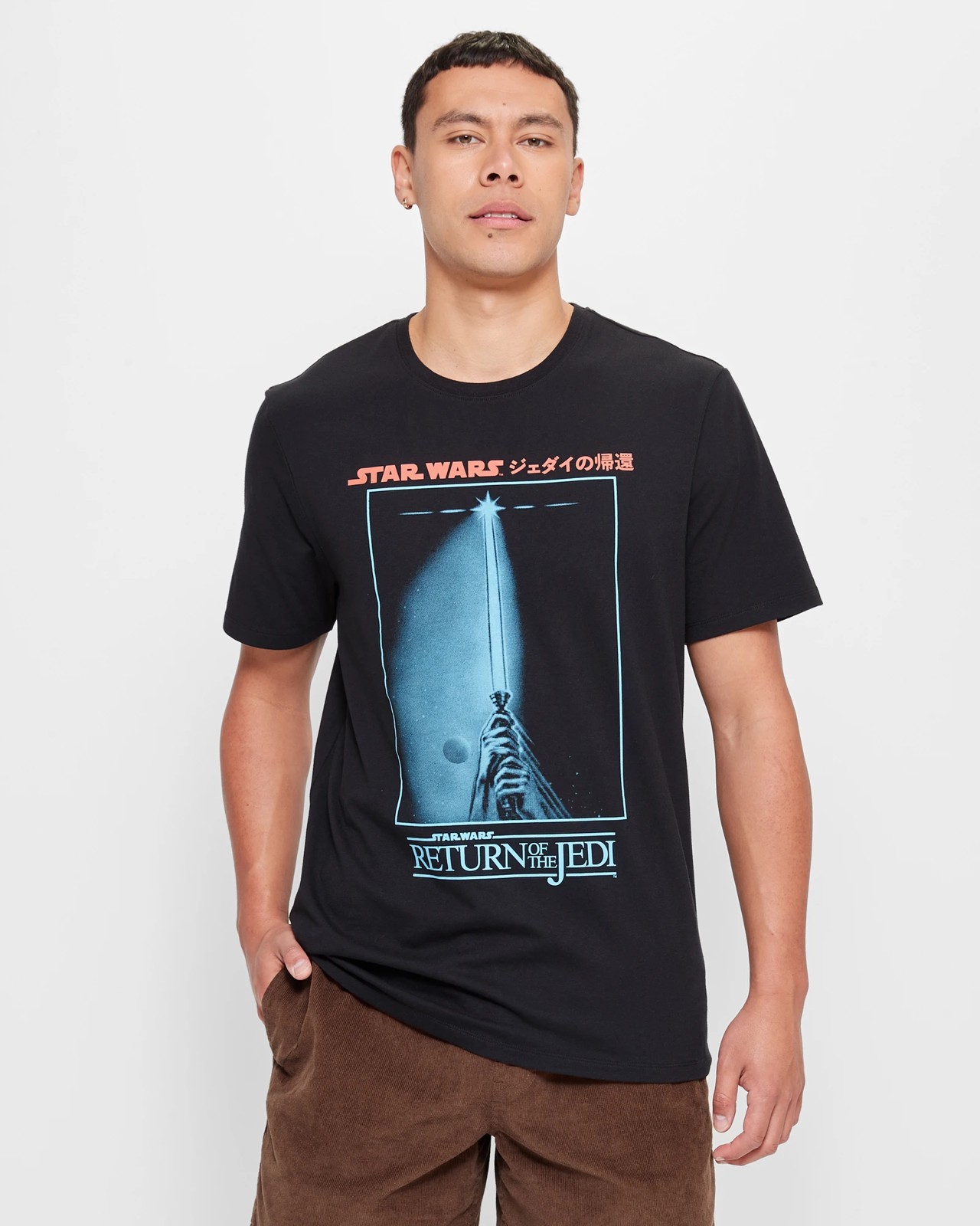 Take your fandom to the next level with our licensed Star Wars Return of the Jedi Light Saber Chest Print T-Shirt. Crafted from a soft blend of cotton and polyester, this regular fit t-shirt features a crew neckline, short sleeves, straight hem and black colouring. The standout feature of this t-shirt is the striking light saber chest print inspired by Star Wars Return of the Jedi. Show off your love for one of the most epic movie series ever made in style with our awesome t-shirt.