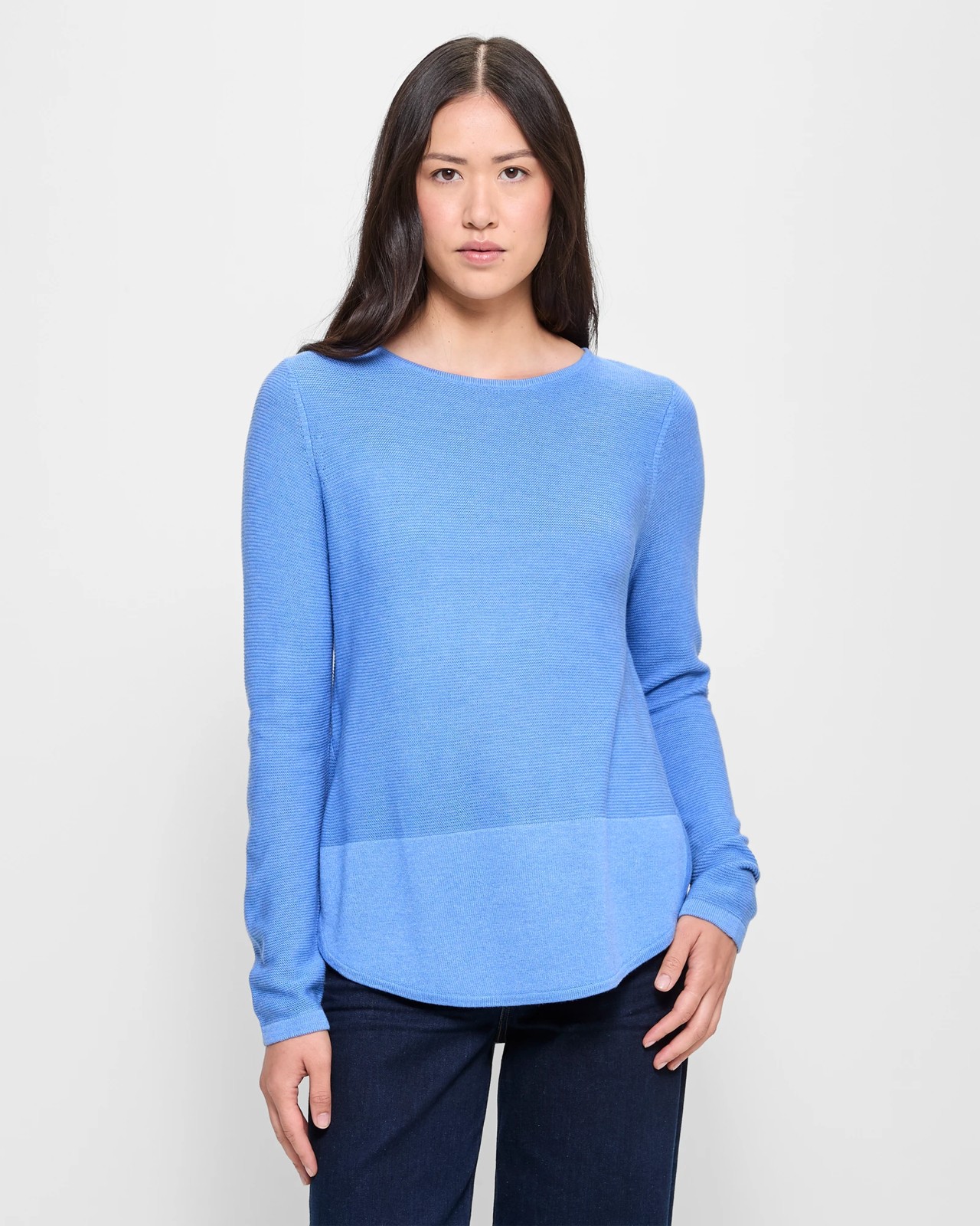 Enjoy the perfect combination of comfort and style with our Stitch Detail Curve Hem Jumper. Made from a soft blend of polyester, viscose, and wool, this jumper features a stylish all-over knit design that fits beautifully. Designed with a rounded ribbed neckline and long sleeves with thin ribbed cuffs, it's ideal for both cosy evenings and fashionable outings. The curved high-low hemline and contrast stitch panel at the bottom offer a distinct and charming look. Make this jumper your go-to item for effortless elegance.