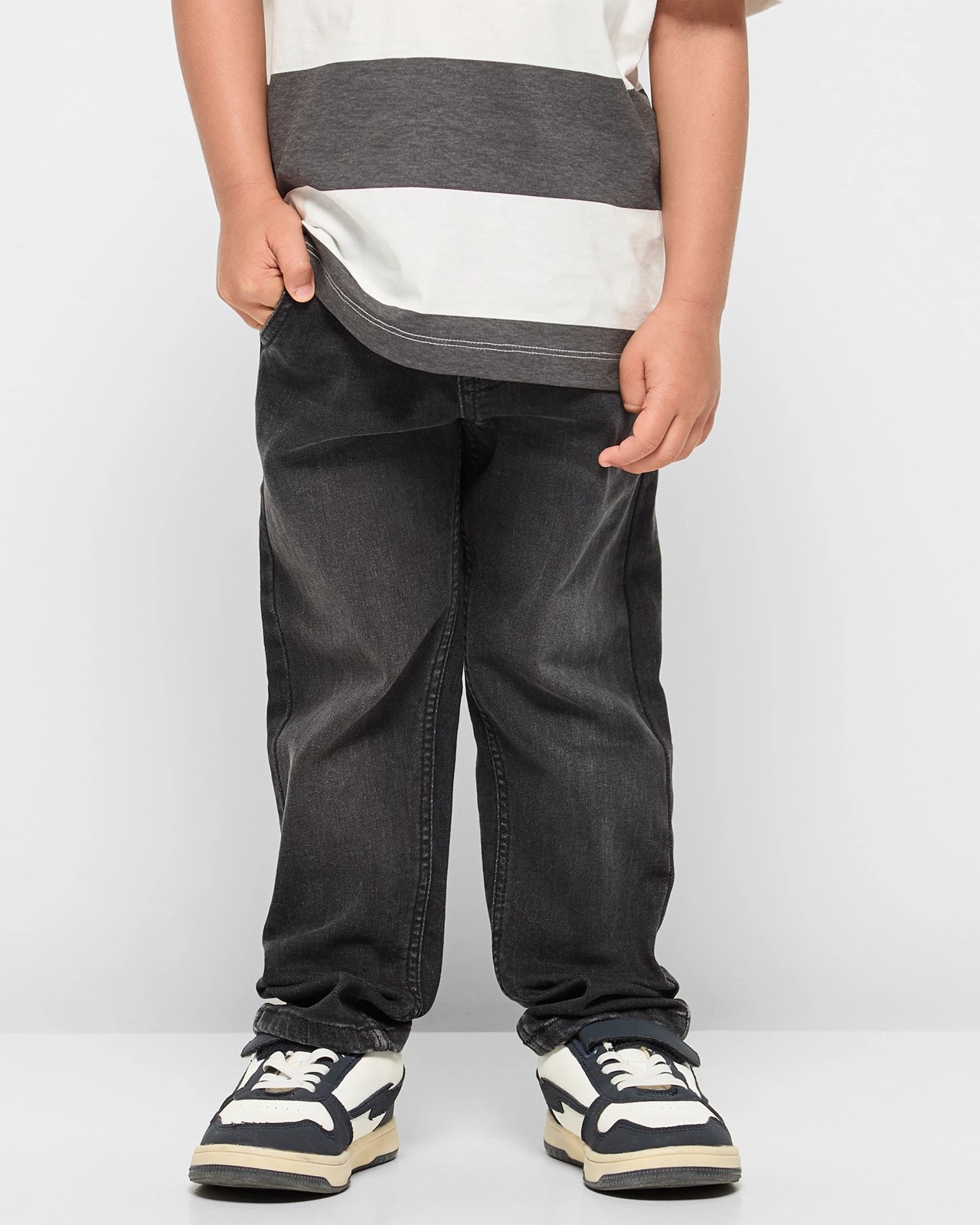 Experience the comfort and chic style of these Straight Pull-On Denim Jeans for your child. Made from soft cotton denim with a bit of stretch, they boast a classic black wash that complements any outfit. The elastic waistband with a drawcord provides a secure and comfortable fit, while the side and back pockets are perfect for carrying little essentials. Designed with a straight-leg cut, these full-length jeans offer ease of movement, making them perfect for everyday adventures. Upgrade your child's wardrobe with these stylish and practical jeans today!