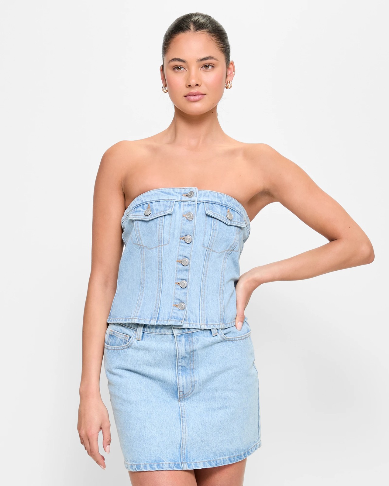 Discover charm with the Strapless Denim Corset Top by Lily Loves. This elegant top seamlessly combines classic corset details with a modern denim fabric. Finished in a delightful light wash blue, it's perfect for various occasions. The structured panelling and button-through front highlight your figure beautifully. Featuring a strapless, straight neckline, it adds a touch of sophistication, while the back elastic ensures a secure and comfortable fit. Ideal for pairing with your favourite jeans or a skirt, make this stunning piece yours today and enhance your wardrobe.