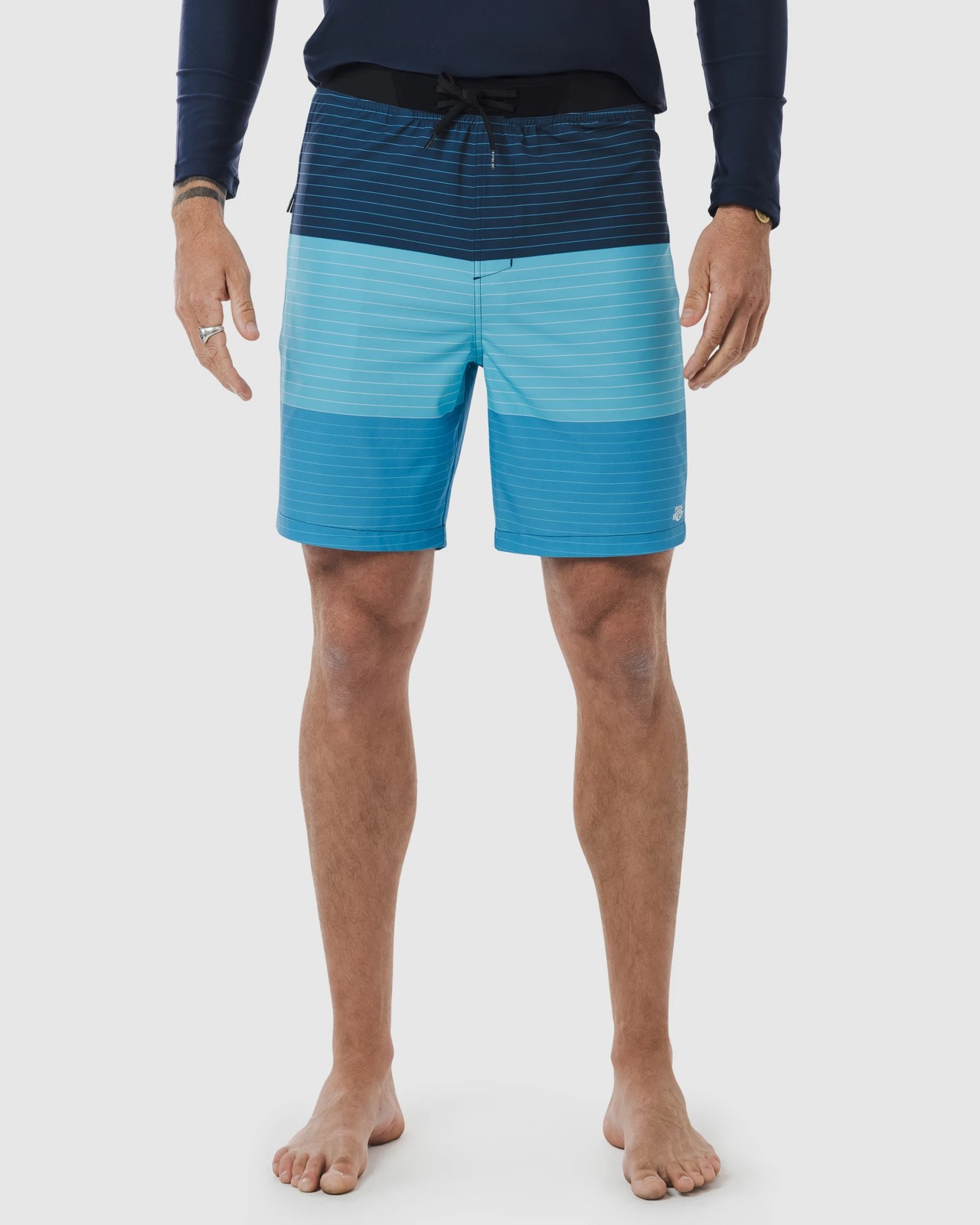 Piping Hot brings its expertise in surf comfort and style to these boardshorts featuring 4 way stretch fabric, an elasticated waist with front tie detail in a blue stripe design.