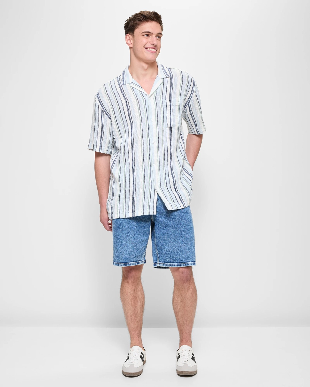 Experience the blend of comfort and style with the Stripe Camp Collar Shirt by Commons. Made from high-quality cotton, this shirt ensures you stay cool and relaxed throughout the day. Its unique knit woven design features a striking stripe pattern that pairs well with various outfits. The shirt's round collared neckline with small lapels and button-through front offer a refined look, while the short sleeves and open chest pocket maintain an easy-going feel. Complete with a straight hemline and a centre-back pleat, it provides excellent mobility. Refresh your wardrobe with this must-have piece!