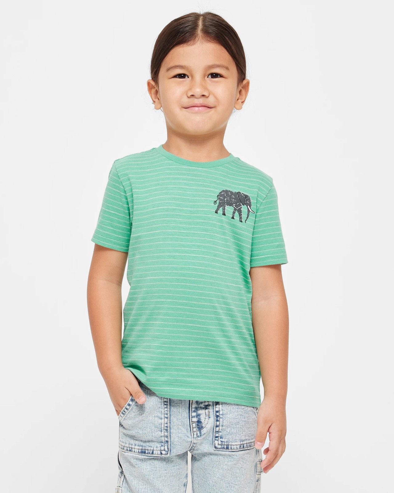 Introducing our Stripe Elephant T-shirt for boys. Made from soft, comfortable cotton with a regular fit, this trendy t-shirt features a charming green stripe pattern that adds a pop of colour to any outfit. The ribbed crew neck and short sleeves ensure a great fit and easy movement. The small elephant print on the chest adds a playful touch to the design. Perfect for casual wear, this t-shirt is versatile and easy to style. Whether for everyday wear or special occasions, this Stripe Elephant T-shirt is a must-have addition to your little one's wardrobe. Shop now and let your child stand out with style!