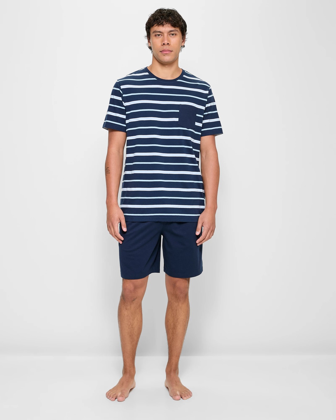 Enjoy ultimate comfort with the Maxx Stripe Pyjama Set. Made from lightweight and breathable cotton, this regular fit pyjama set includes a stylish striped t-shirt and navy blue shorts. The t-shirt features a ribbed crew neckline and short sleeves for a relaxed feel, while the shorts come with a thick elastic waistband and handy side seam pockets. Perfect for lounging around the house or a cosy night's sleep, grab this set and experience luxury and comfort in every wear.
