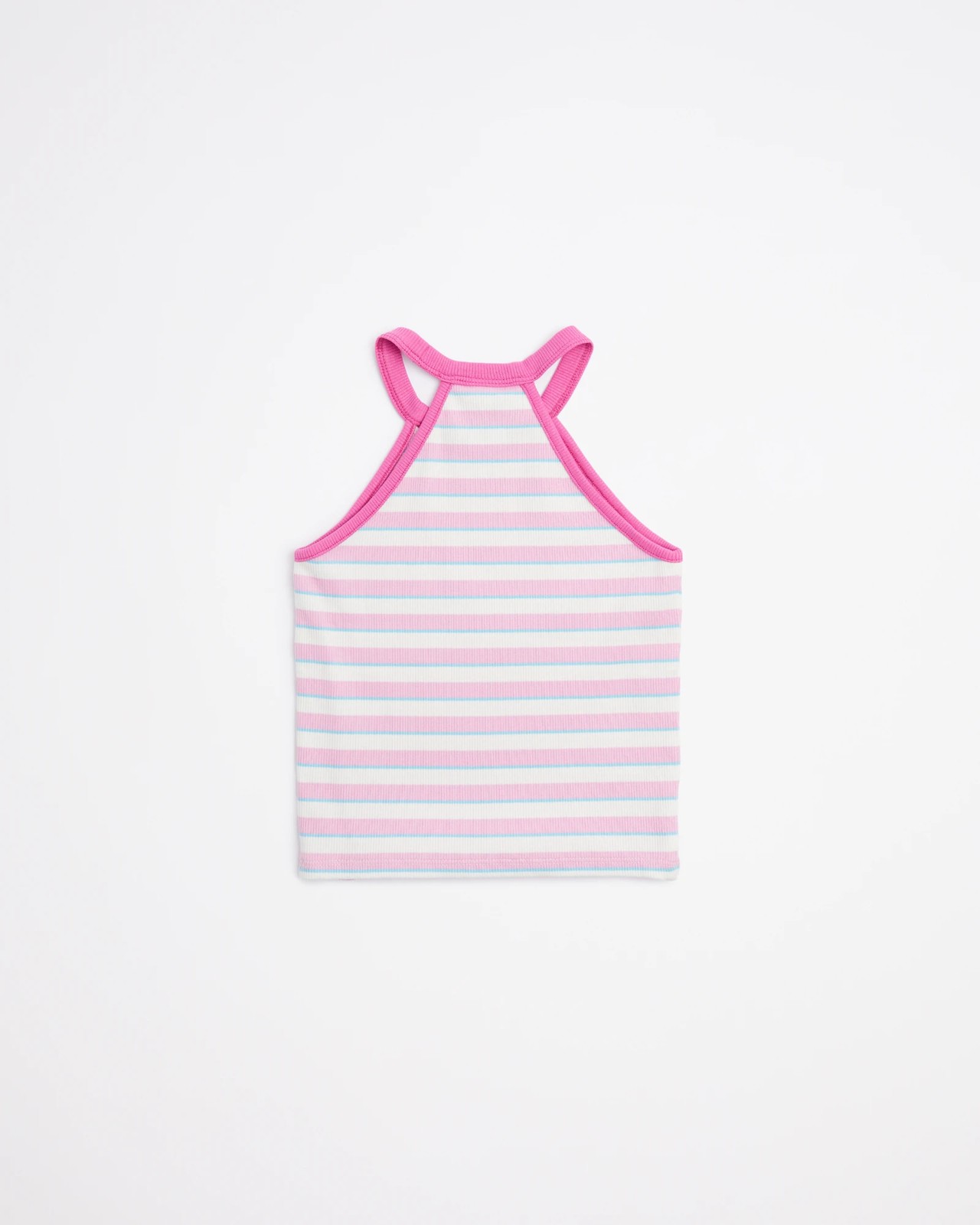 Look stylish and stay comfortable in this Rib Halter Tank. Crafted from a cotton rich blend, this tank features a regular fit with a rib design and an all over stripe print. The straight hem makes it ideal for pairing with shorts or jeans. Whether at the beach or around town, this tank is sure to keep up with all of her adventures.