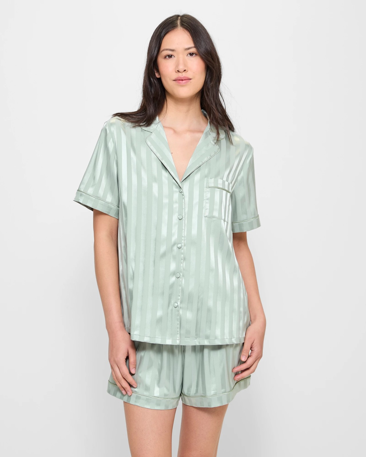Introducing the Stripe Satin Short Pyjama Set from Target. This two piece set is designed with a soft satin feel for maximum comfort. The top features a round collared neckline with lapels, short sleeves, button through front, piping, chest pocket and a straight hemline. The shorts have an elastic waistband and are cut in a short length. With all over stripe design, slip into this effortlessly chic pyjama set for an effortless night's sleep!
