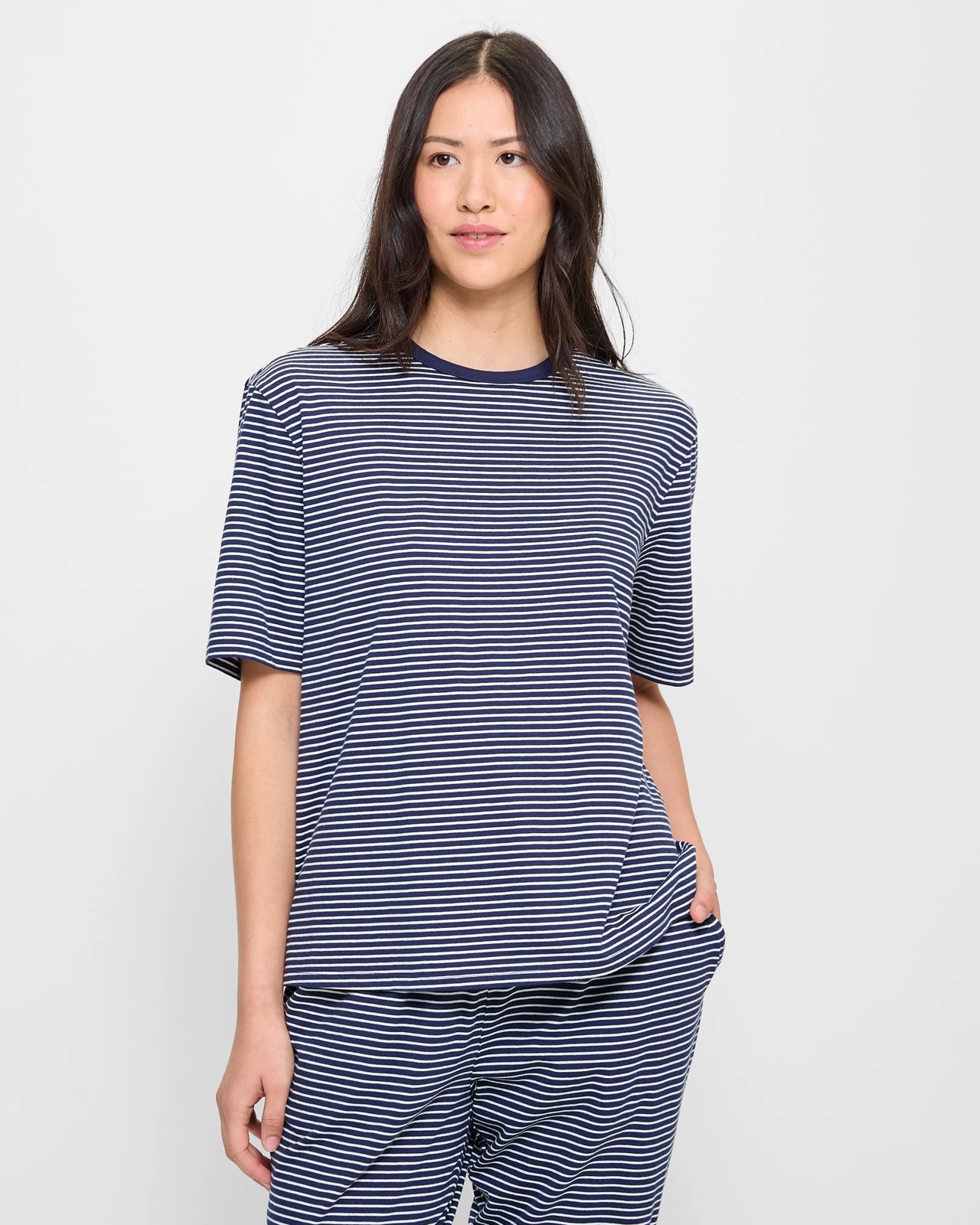 Experience the ultimate comfort with our Stripe Sleep Top. Crafted from a soft cotton fabric, its lightweight and airy design ensures a peaceful night's sleep. The regular fit, navy blue and white stripe pattern, and ribbed crew neckline add a stylish touch. Perfect for lounging or bedtime, the short sleeves and straight hemline offer a relaxed feel. Upgrade your sleepwear collection today!