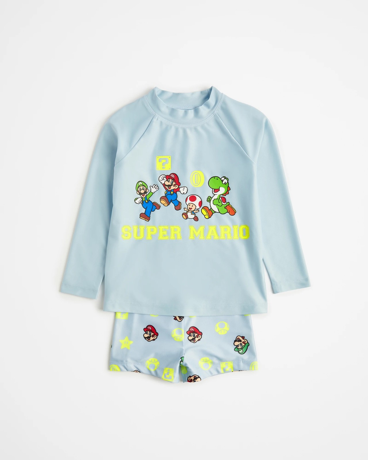Stay protected this summer with the Boys Super Mario Swim Set from the beloved brand, featuring UPF 50+ sunprotection. This two-piece set includes a light blue long sleeved top with a stand collar and raglan sleeves for full range of movement in the water. It also features an iconic Super Mario print to the chest and a straight hem. The matching all over print trunks come with an elastic waistband and lined front for extra support. Perfect for those hot summer days!