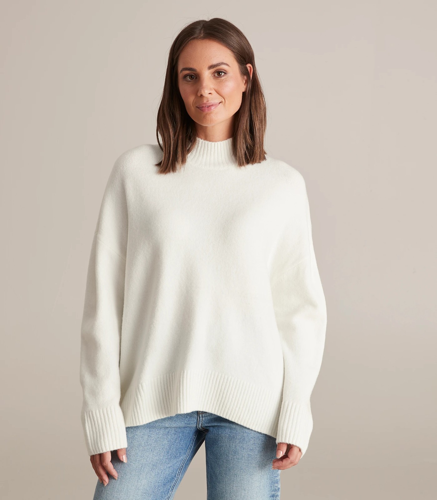 For a great everyday jumper to keep you warm, the super soft high neck knit sweater features a super soft fabrication for comfort, long sleeves and a funnel neck high neckline for added warmth.