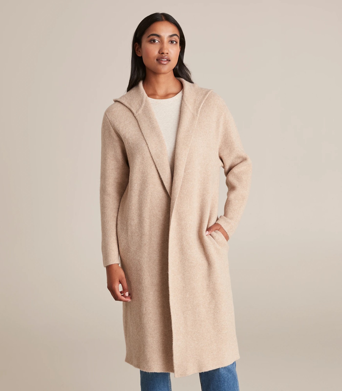 A great coverup with an all over knit design and super soft wool blended material, the super soft lounge hooded coatigan also features long sleeves, a hooded neckline and an open front.
