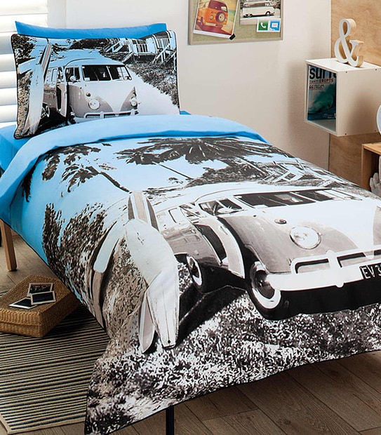Surfs up! Your boy will be drifting off to dream of a surfing safari with under our Surf Shack Quilt Cover Set. Made of 225 thread count polyester cotton its super soft and has cord piped edges for a quality make and finish. Featuring a monochrome print on a fade-out blue background, it easily co-ordinates with bedding and accessories form Target's range.