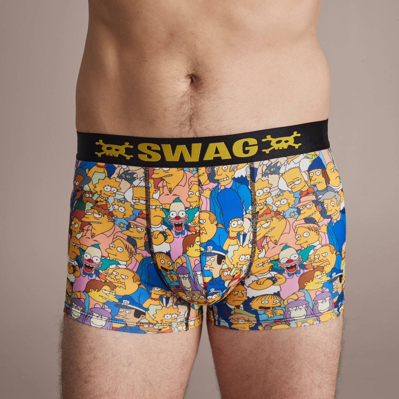 Take your wardrobe to the next level with our ultra-soft Mens Swag Trunks. The trunks are made of premium micropolyester fabric that is designed for maximum comfort and flexibility. The Simpsons print adds a fun, novelty touch to your look. The ultra-premium satin waistband and contoured pouch provide added support for a snug fit. With a regular fit and straight hemline, these trunks are sure to make an impact on your style.