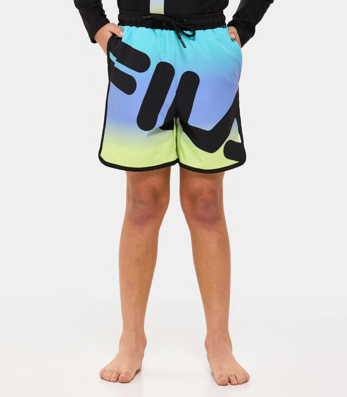 Make a splash with the stylish Fila Aston boardshort from Fila. These boardshorts are crafted from a blend of Polyester/Elastane with Polyester mesh lining, contrast binds, elasticated waistband and drawcord. Featuring a large diagonal Fila print to the front, hip pockets and an ombre all over print for an on trend look. Perfect for those summer days spent by the pool or in the sea. Pair with the Aston Rashi (sold separately) for a coordinated swimwear fit.