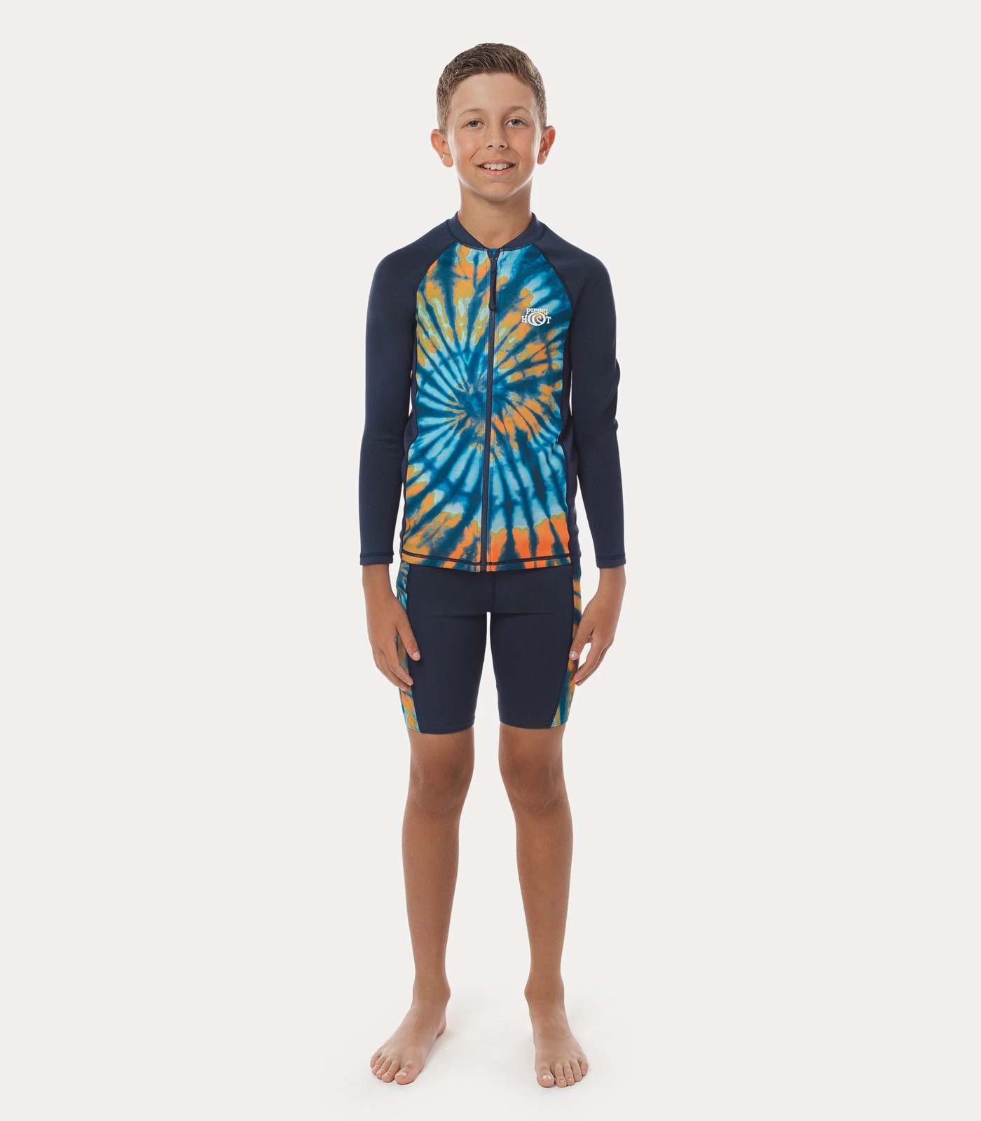 Great for the beach or the pools, come these comfortable Piping Hot jammers. Featuring blue tie dye paneling. Matching rashvest sold separately.
