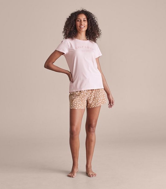 Perfect for the warmer weather, the chalk pink and praline shorts and tee sleep set is the greatest sleep accessory this summer. It features a short sleeve tee, a chest print top and printed shorts and has a cotton rich fabrication for breathability.