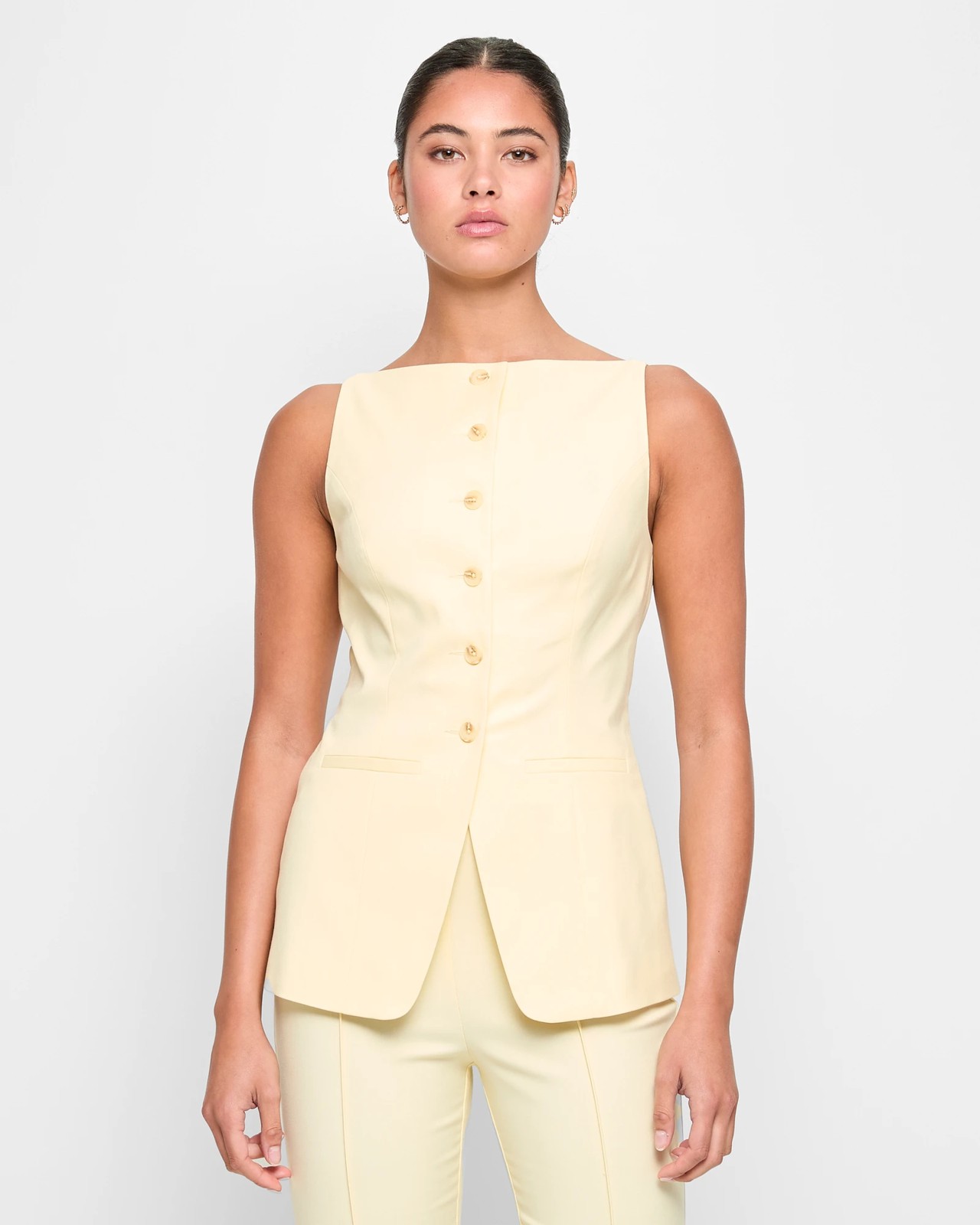 Discover refined style with the Tailored Boat Neck Vest by Lily Loves. Designed from quality polyester and viiscose with stretch for comfort, this vest offers a sophisticated boat neckline and a fitted shape. Its sleeveless structure and convenient front pockets make it ideal for layering over your preferred tops. The side panels and straight hemline contribute to its chic and polished look. Add this versatile piece to your wardrobe for an instant style upgrade!