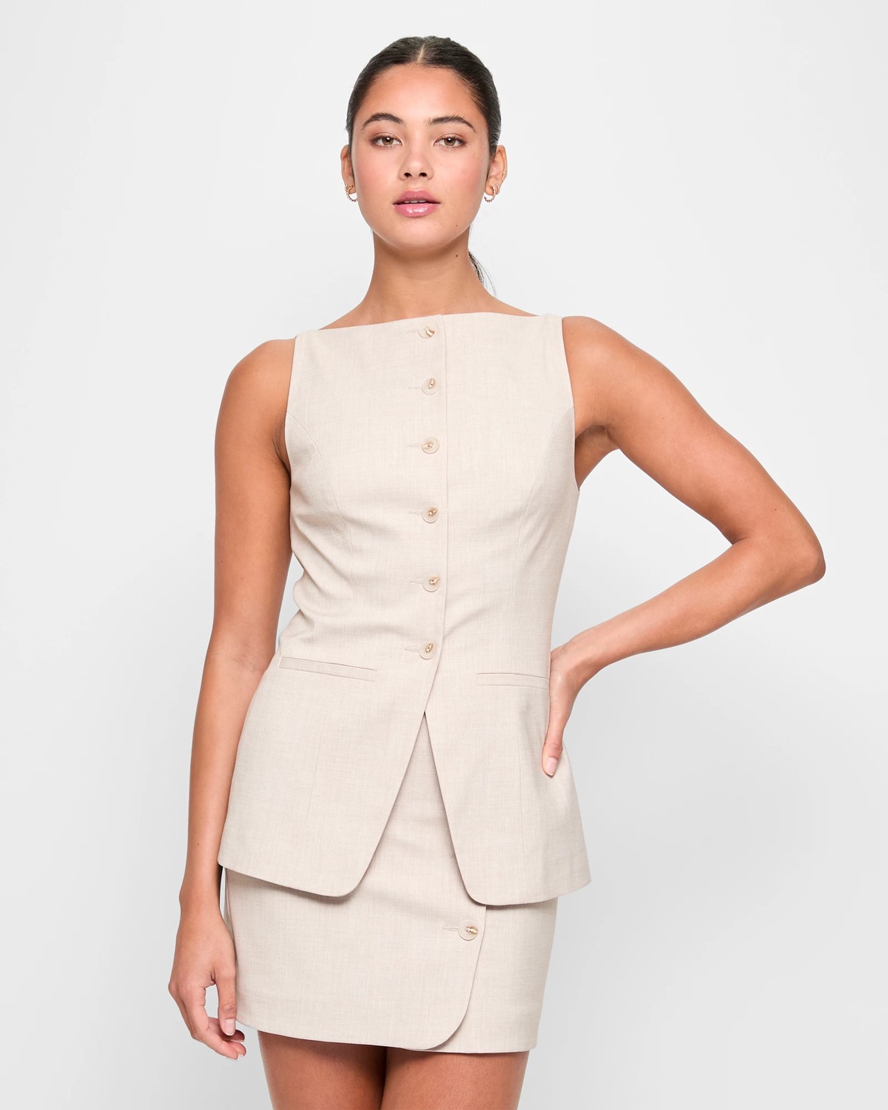 Discover refined style with the Tailored Boat Neck Vest by Lily Loves. Designed from quality polyester and viscose with stretch for comfort, this vest offers a sophisticated boat neckline and a fitted shape. Its sleeveless structure and convenient front pockets make it ideal for layering over your preferred tops. The side panels and straight hemline contribute to its chic and polished look. Add this versatile piece to your wardrobe for an instant style upgrade!