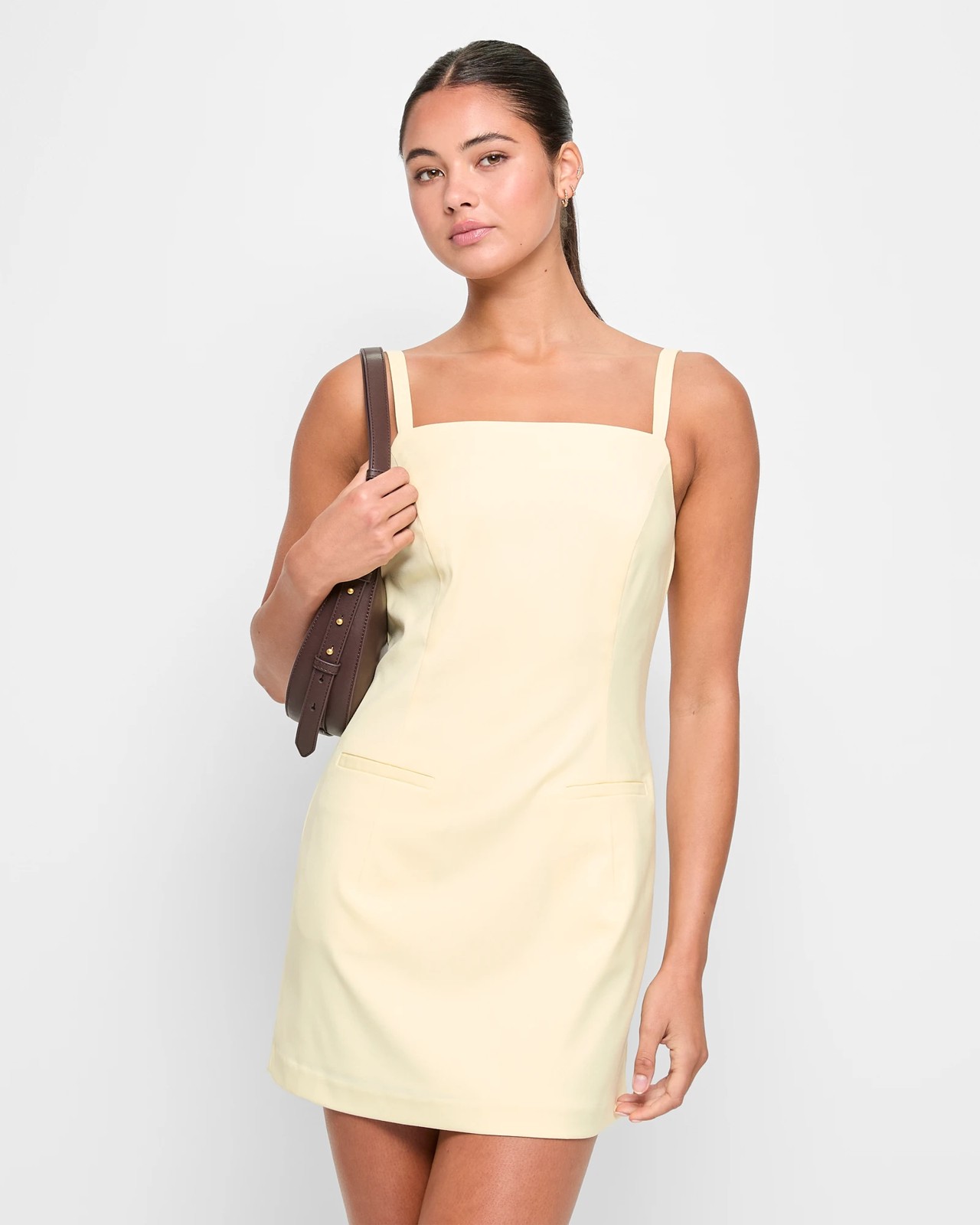 Introducing the Tailored Mini Dress by Lily Loves. This sophisticated dress is composed of a soft polyester and viscose blend, enhanced with elastane for added comfort. The dress features a stylish square neckline and delicate thin shoulder straps, making it perfect for any event. Its internal lining adds smoothness, while the panel detailing ensures a precise fit. With practical front open pockets, this mini-length dress offers both style and functionality. The invisible zip closure at the back completes the ensemble. Don't miss the chance to add this chic dress to your wardrobe.