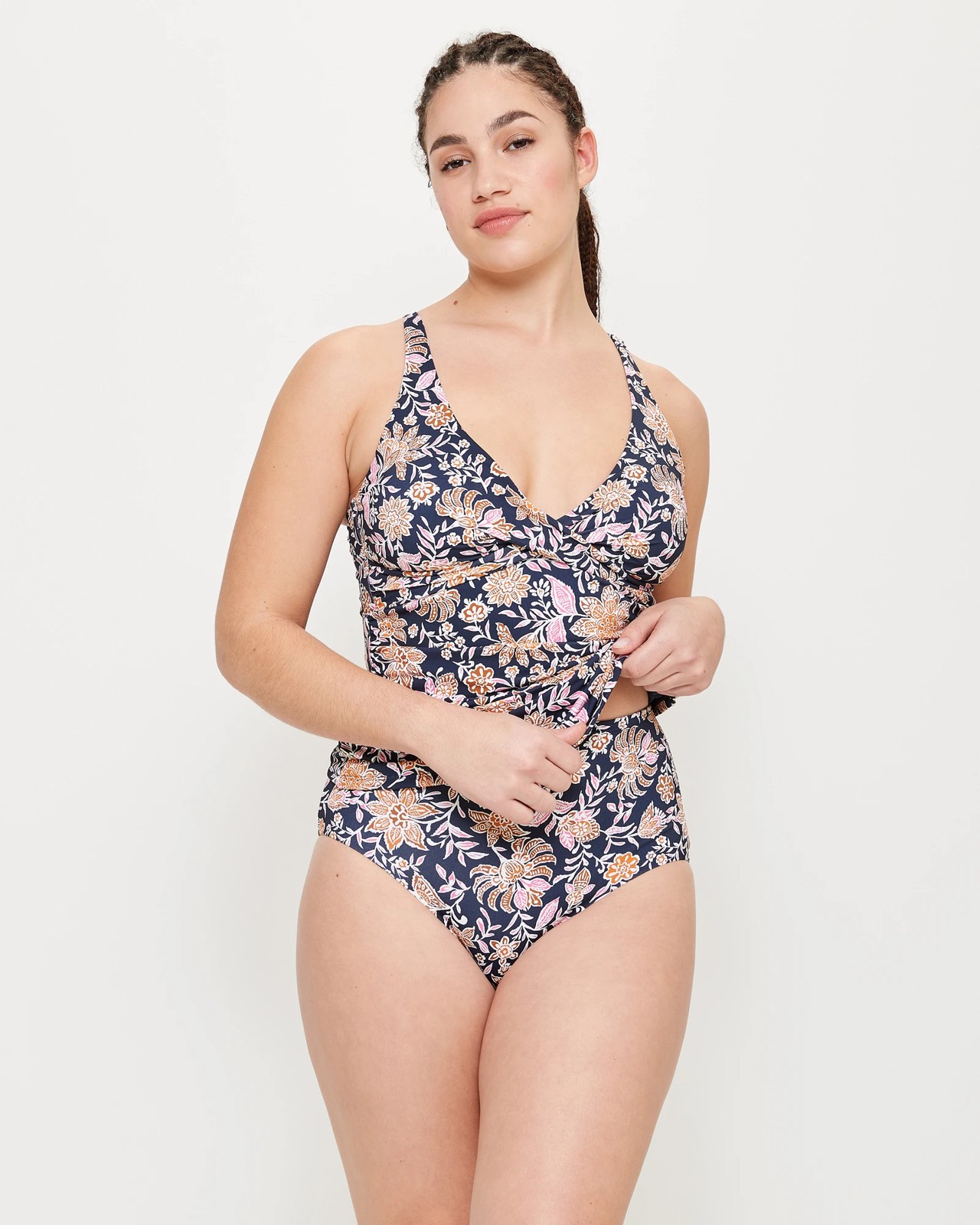 Experience the ultimate in body shaping and comfort with our tankini top. Crafted from a soft nylon fabrication and designed with recycled materials, this top is perfect for your next beach day or pool party. The power net lining is designed to slim and shape your body, while the twist front and removable padded cups provide extra coverage and support. Get ready to look and feel your best with our stylish tankini top!