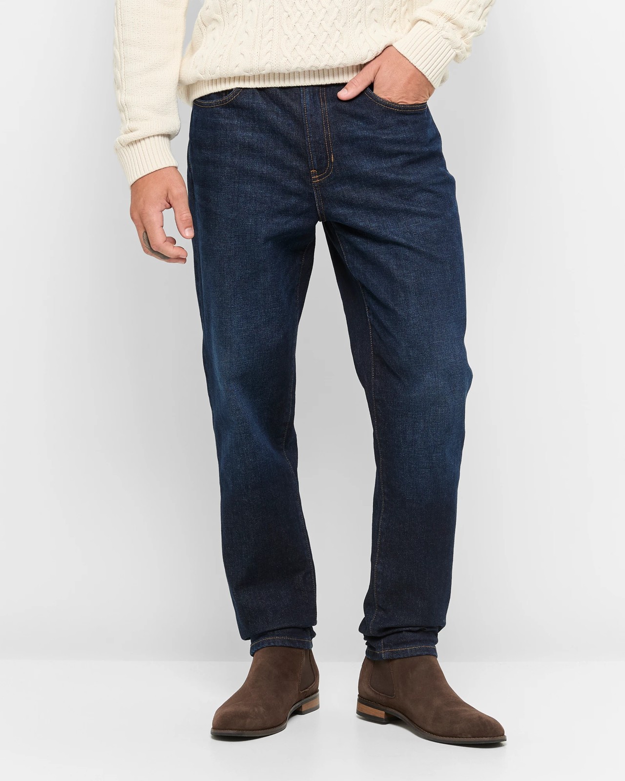 Embrace comfort and style with our Tapered Denim Jeans for men. Designed from a premium cotton blend with stretch elastane, these jeans offer a regular fit that maintains their deep black colour. The structured waistband with belt loops, classic 5-pocket design, and front button and zip fly closure provide practical features. The tapered legs and straight hemline add a modern touch, while the back pleather patch on the waistband completes the look. Elevate your everyday outfit with these versatile jeans.