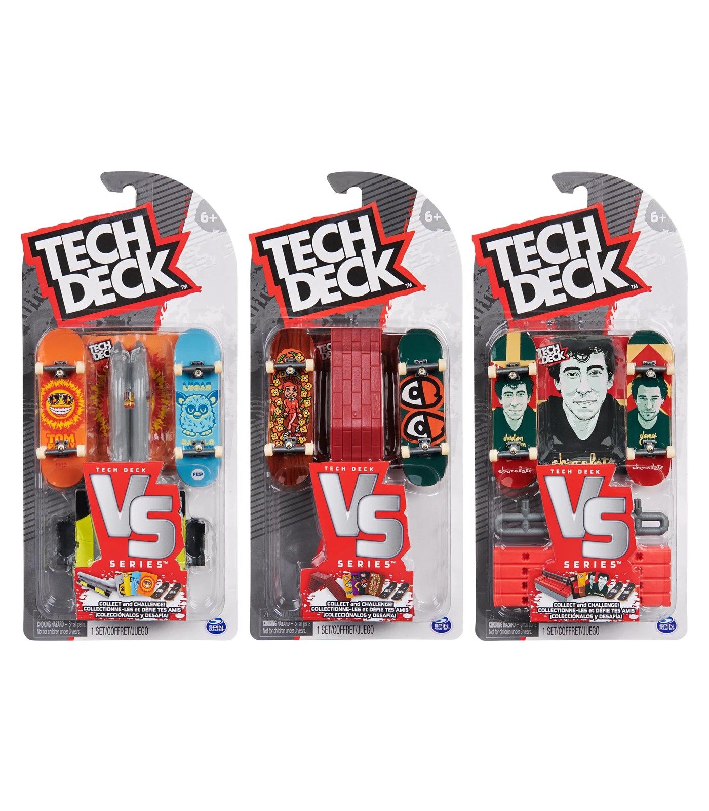 The whole word is your skatepark with real street obstacles to skate. Inside every Versus Series 2-Pack are two full fully assembled fingerboards, a street feature so you can start your freestyle fun right away, and Challenge Cards to collect and battle other skaters! Tech Deck Versus lets you start small and cruise around on an official mini skateboard featuring authentic graphics from real skate companies! Then go big and move from piece to piece, stringing together some sick street lines! Pop an ollie, slide a ledge, or grind a rail and pull off a sick flip trick to finish! Use the Challenge Cards to pull up different fingerboard tricks and battle your friends. Draw a card and whoever can complete the trick on their turn wins! Tech Deck Versus Series has everything you need to learn and battle other fingerboarders. Tech Deck finger skateboards and ramp sets are for kids and skate-lovers ages 6 and up. If you want real skate graphics from real skate companies, then it has got to be Tech Deck — start small, go big and collect them all!
