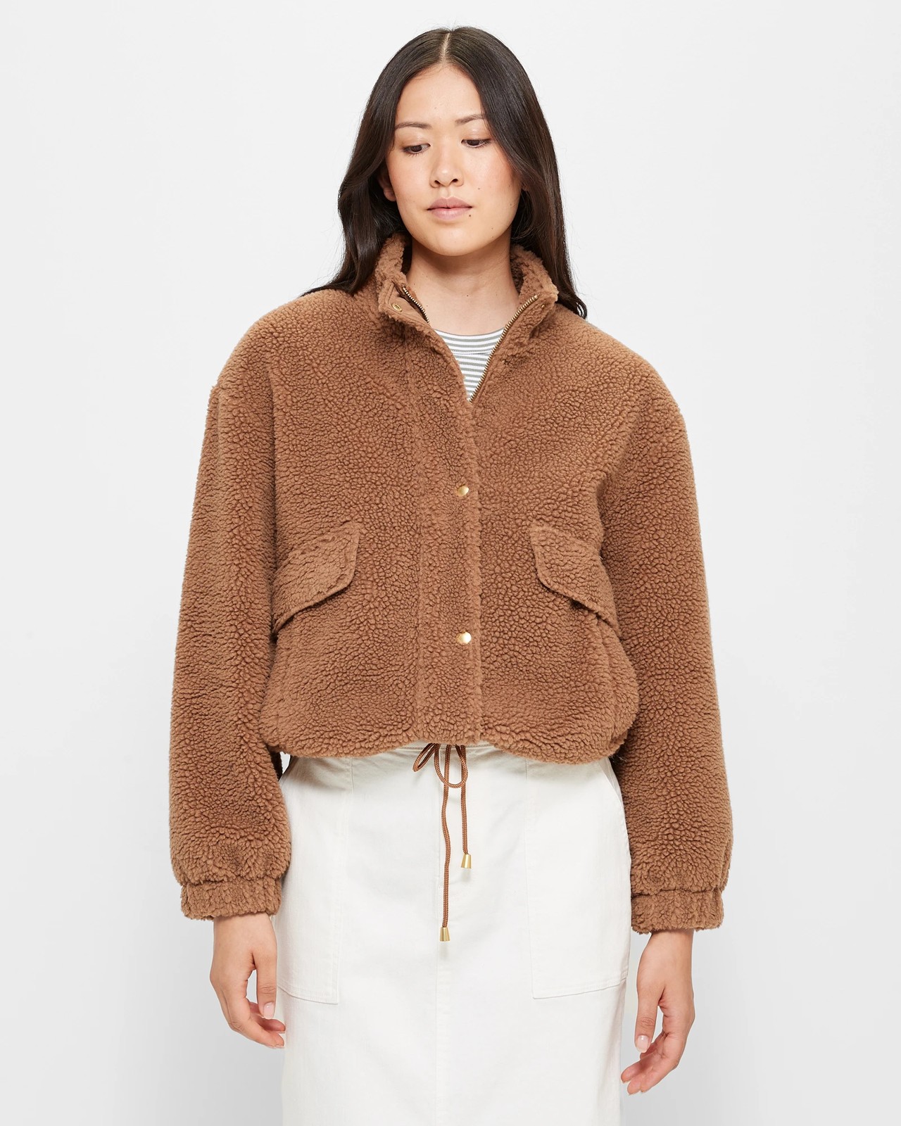 Introducing our Teddy Button Through Bomber Jacket, the perfect addition to your wardrobe this season. This bomber jacket is made from a high-quality polyester fabrication and is fully lined for added comfort. We are proud to say that this jacket contains recycled materials, making it a sustainable choice. The all over teddy look adds a touch of texture and style. The regular fit and round high neckline provide a flattering silhouette. The zip through front and over zipper flap with press stud closure ensure a secure and stylish fit. The long elastic cuff sleeves and mock fold over top add extra details. With front pockets and a straight hemline with pull toggles, this jacket is both practical and fashionable. Complete your outfit with our Teddy Button Through Bomber Jacket and stay warm and stylish all season long!