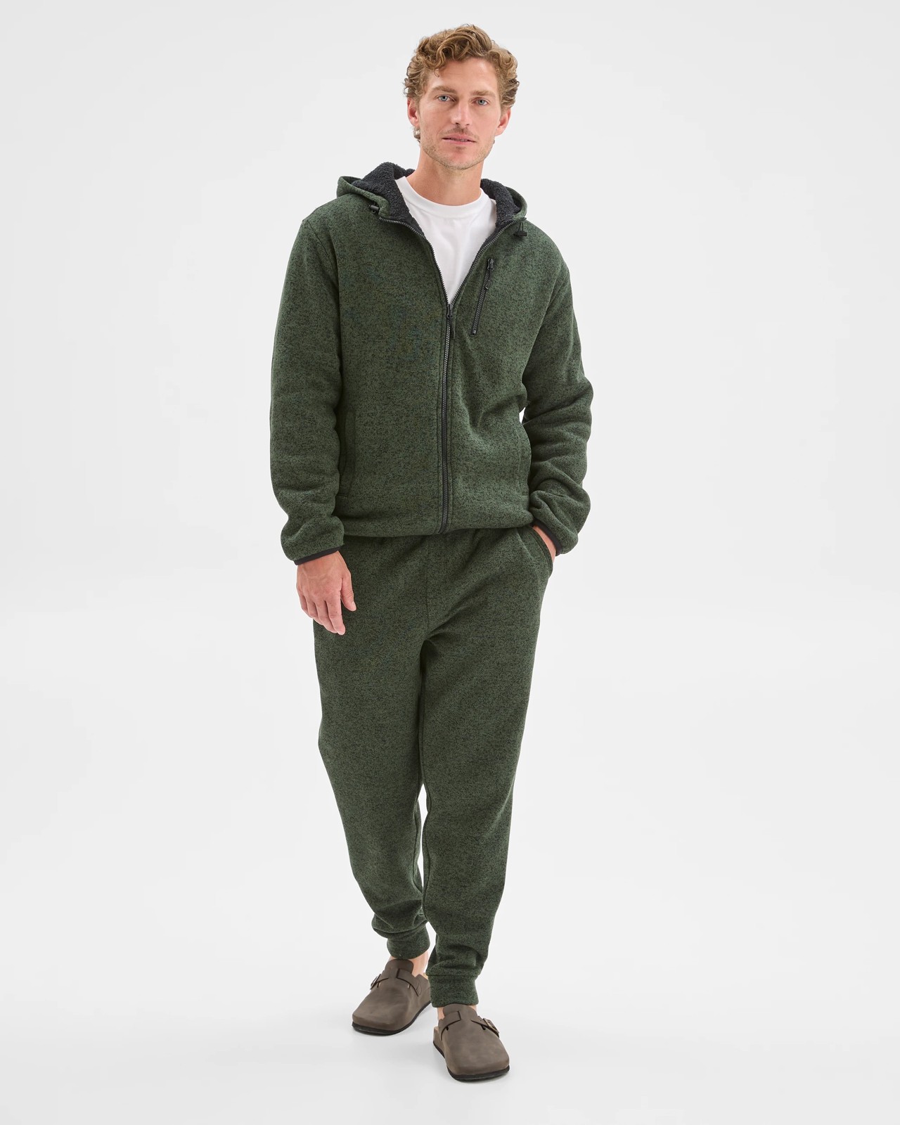 Teddy Lined Zip Through Fleece Hoodie - Green Marle