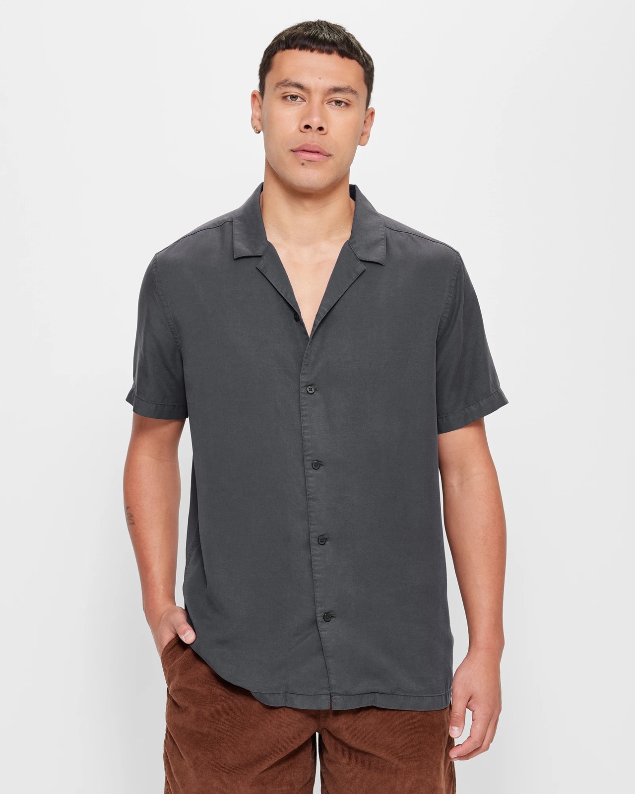 Make a style statement in our Tencel Revere Mens Shirt. Crafted from soft and breathable tencel fabric, it offers a regular fit and is perfect for casual occasions. It features a collared neckline with lapels, button-through front, short sleeves and a back centre pleat for easy movement. With its straight hemline, this shirt will be a stylish addition to your wardrobe!