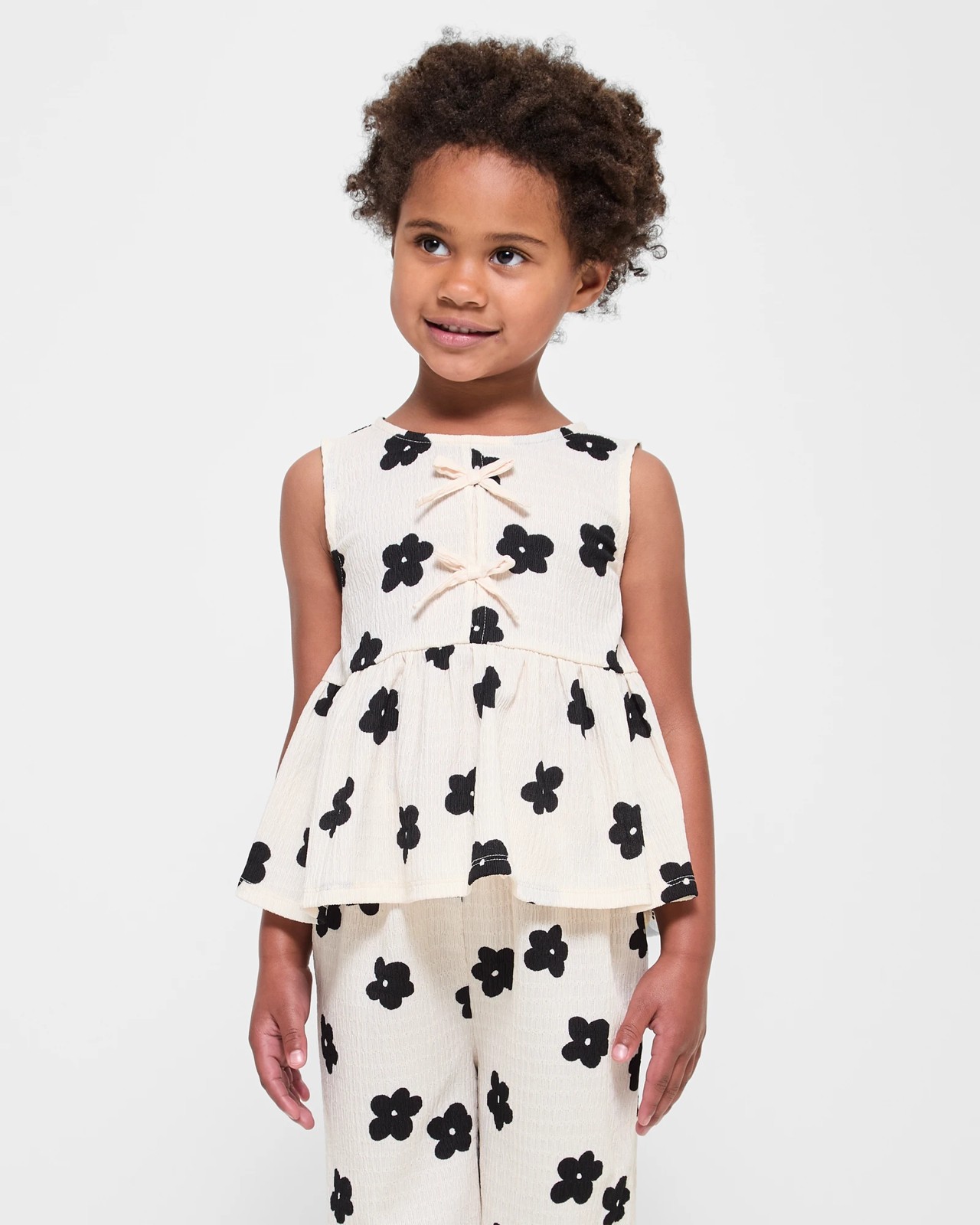Add a touch of charm to your girl's collection with the Textured Bow Tank. This sleeveless top showcases cute bow appliques on the front and a fun peplum hemline, perfect for sunny days. Featuring a gathered waistband and a round neck, this tank offers a cosy fit combined with stylish flair. The keyhole button at the back brings an extra element of detail. Make her everyday outfits more delightful with this standout piece. Secure yours now and let her confidence flourish.
