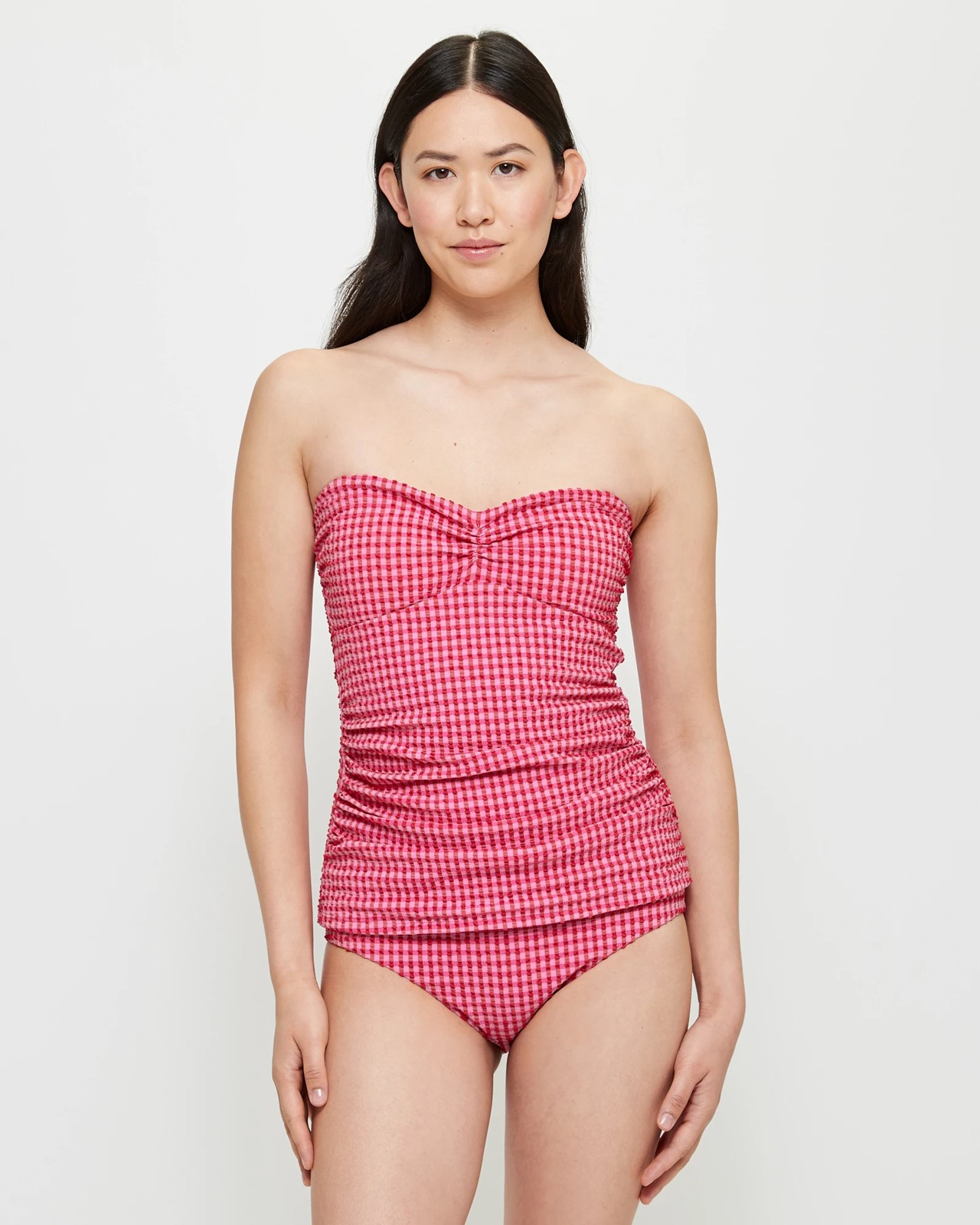Indulge in the ultimate poolside attire with our Textured Halter Tankini Swim Top. Crafted from a high-quality blend of nylon and polyester, this swim top offers maximum comfort thanks to its stretchy fabric. Designed to shape and slim your body, it features a power net lining that provides extra support. The regular fit and charming pink/red check print make it a stylish choice for any beach or pool gathering. The sweetheart neckline and halter tie straps add a touch of femininity to the overall look. With wirefree construction and removable padded cups, this tankini top ensures a customizable fit and hassle-free wear. The ruching down the sides and curved hemline further enhance your silhouette. Complete the look by pairing it with our matching swim bottoms (sold separately). Embrace the confidence and grace that our Textured Halter Tankini Swim Top brings, and make a splash this swim season.