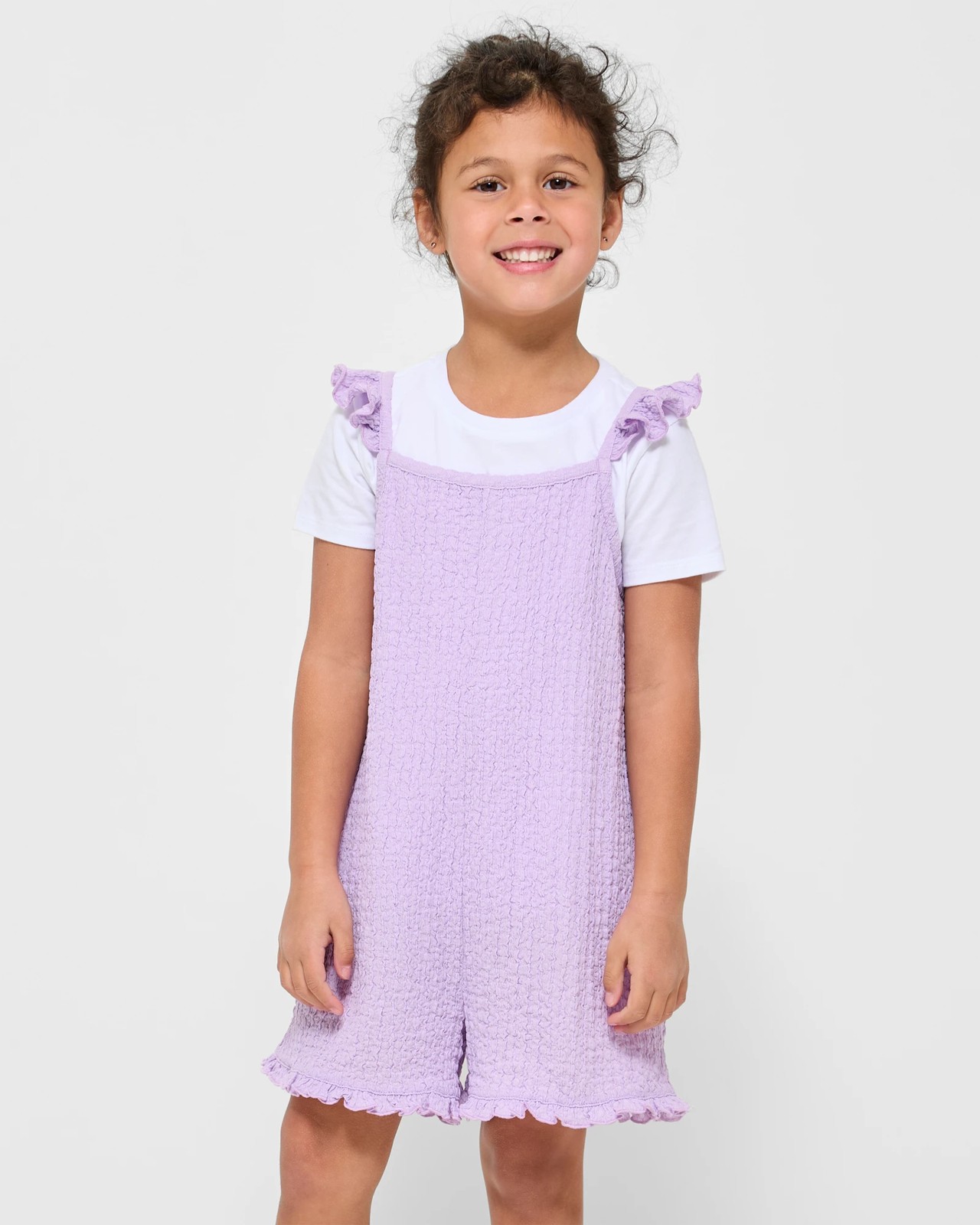 Bring style and comfort together with our Textured Playsuit for young girls. Enjoy the soft touch of the recycled material used in crafting these pieces. The set features a trendy square neckline and delicate spaghetti straps with charming frill details. The textured fabric of the playsuit adds a unique touch, while the frill hemline and short length create a chic look. Complete her outfit with the basic t-shirt included. Upgrade her wardrobe with our two-piece set and step out in confidence and style.
