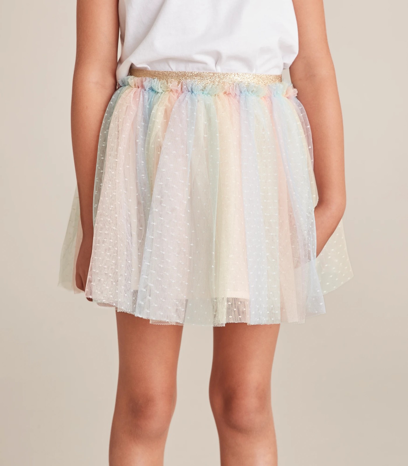 Great for dress ups or as partywear, the Textured Tulle Skirt features an exposed glitter elastic waistband and layered rainbow tulle design with textured polka dots, for ultimate party time!