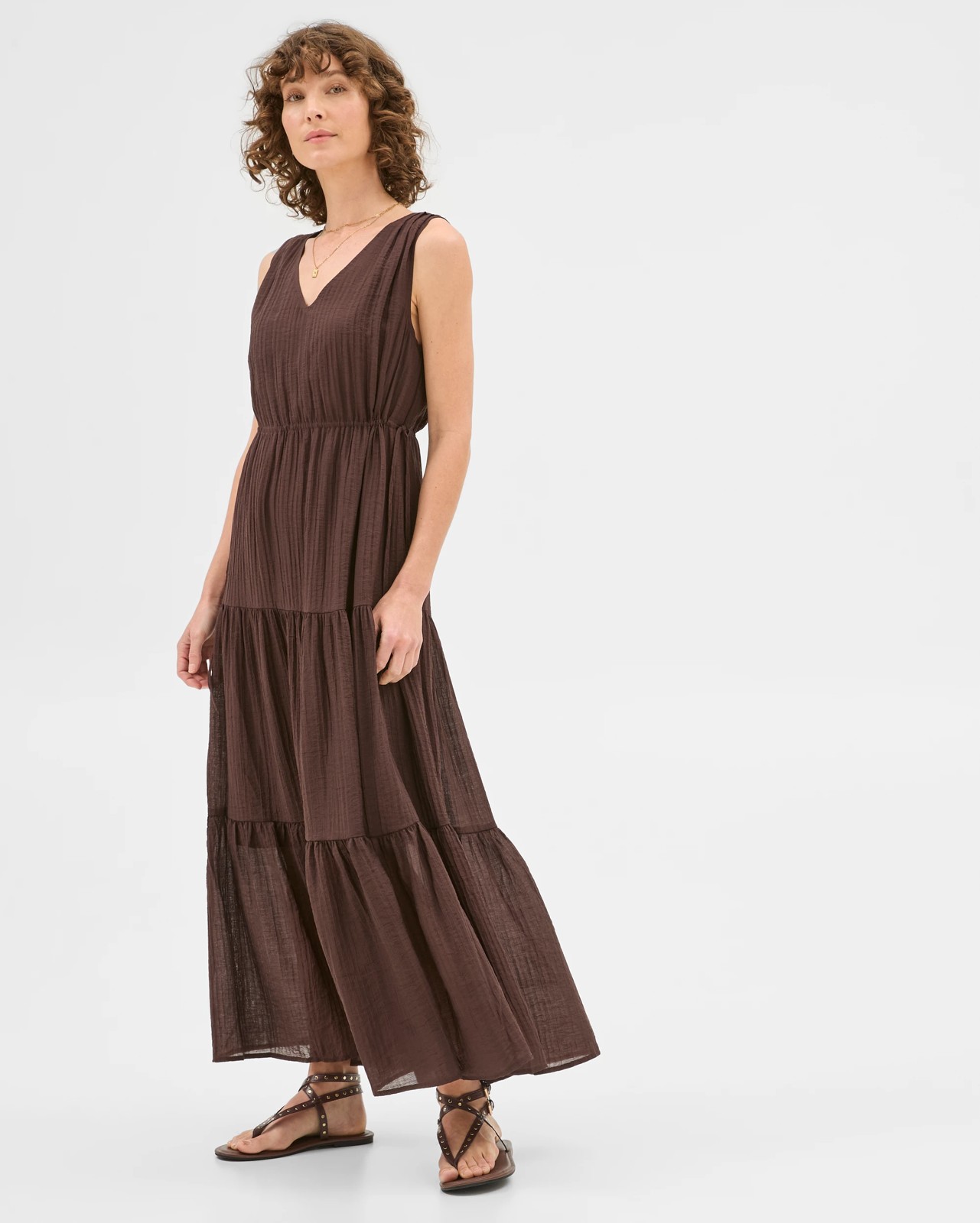 Embrace the joy of dressing up with this textured v-neck sleeveless tiered dress in a beautiful brunette brown. Featuring a V-neckline and gentle shoulder gathers, it's designed for comfort with an inner cotton lining and a soft viscose blend. The pull tie under the bust offers a personalised fit, while delicate panelling enhances the elegant flow of the midi-length skirt. From relaxed weekends to special gatherings, this dress will help you feel your best and bring a hint of charm to your day. Treat yourself to a fresh look and step out with confidence.