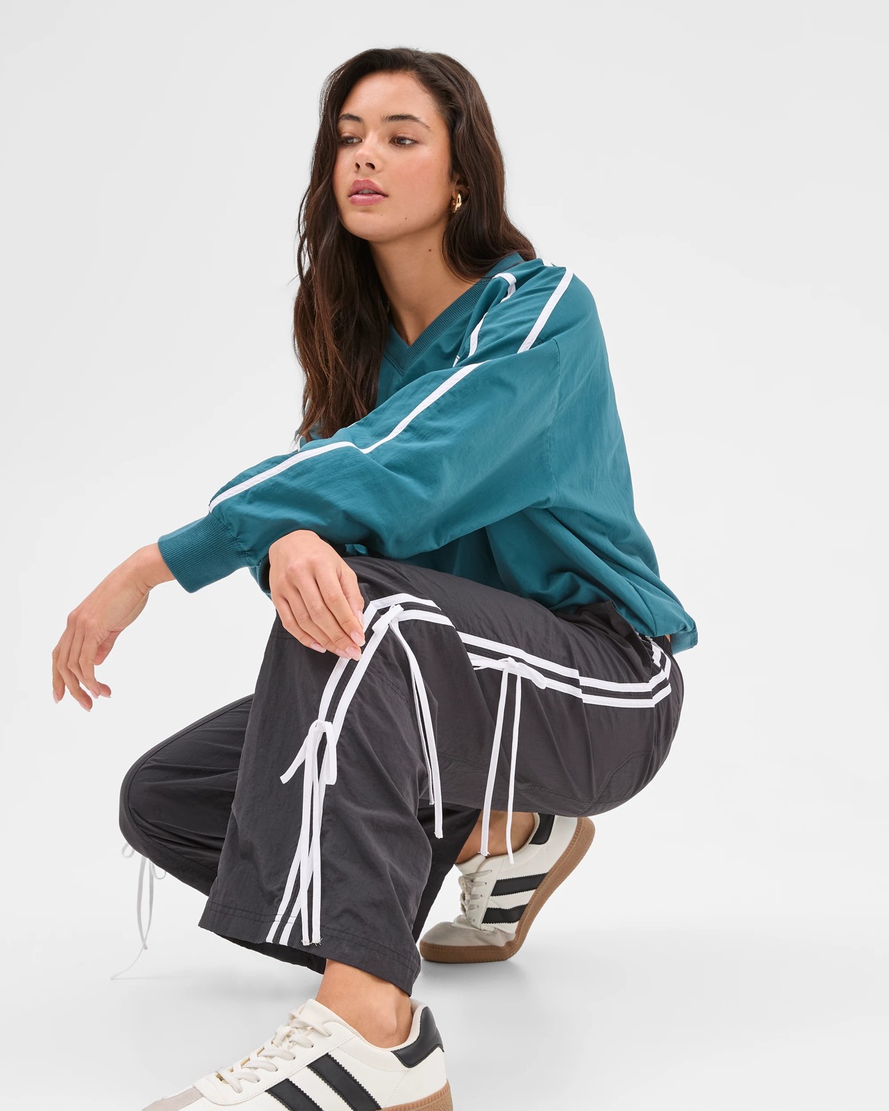 • Side seam white stripes down legs with decorative ties
