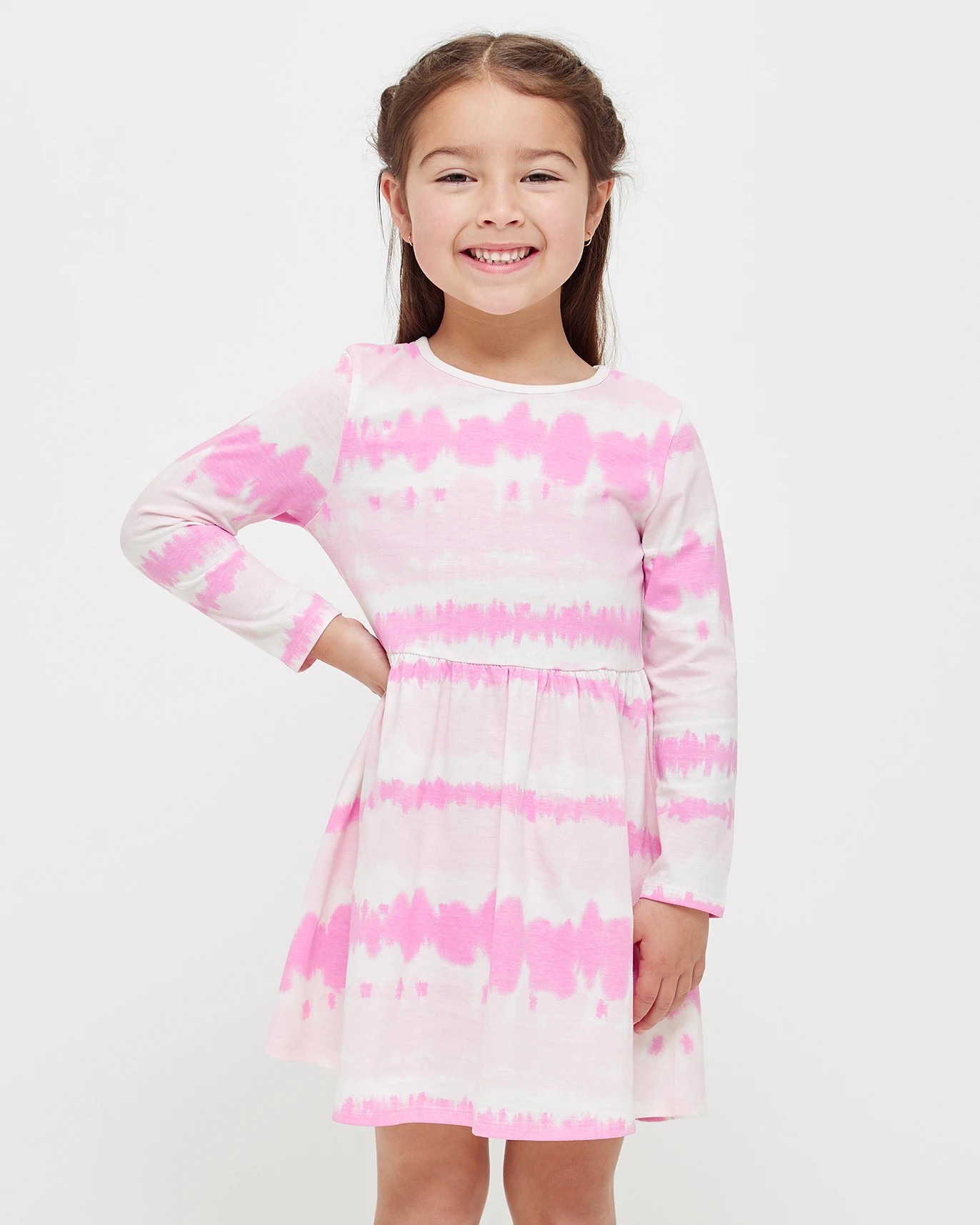 Say hello to the perfect summer dress for girls! Our Tie-Dye Dress is made with a cotton rich fabric and features a beautiful pink tie-dye pattern. A classic round neckline, long sleeves and gathered elastic waistband provide a timeless look, while the A-line fit is sure to flatter any figure. Whether it's for a special occasion or just everyday wear, this eye-catching dress is sure to make her stand out!