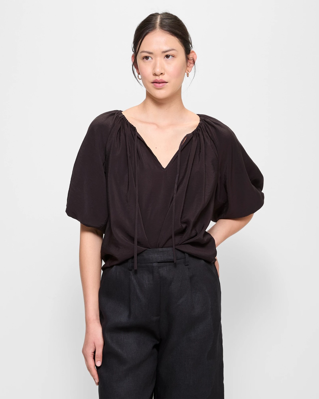 Unveil a touch of sophistication with our Tie Front Blouse from the Preview collection. This blouse is designed from a smooth blend of viscose and nylon, featuring a distinct textured appearance. Its round neckline and chic tie-up front with a v-keyhole offer a modern twist. The short puff sleeves with elastic cuffs and the elegantly curved hemline add a hint of femininity. This versatile piece is perfect for any wardrobe addition, enhancing your daily style. Order yours today and see the difference!