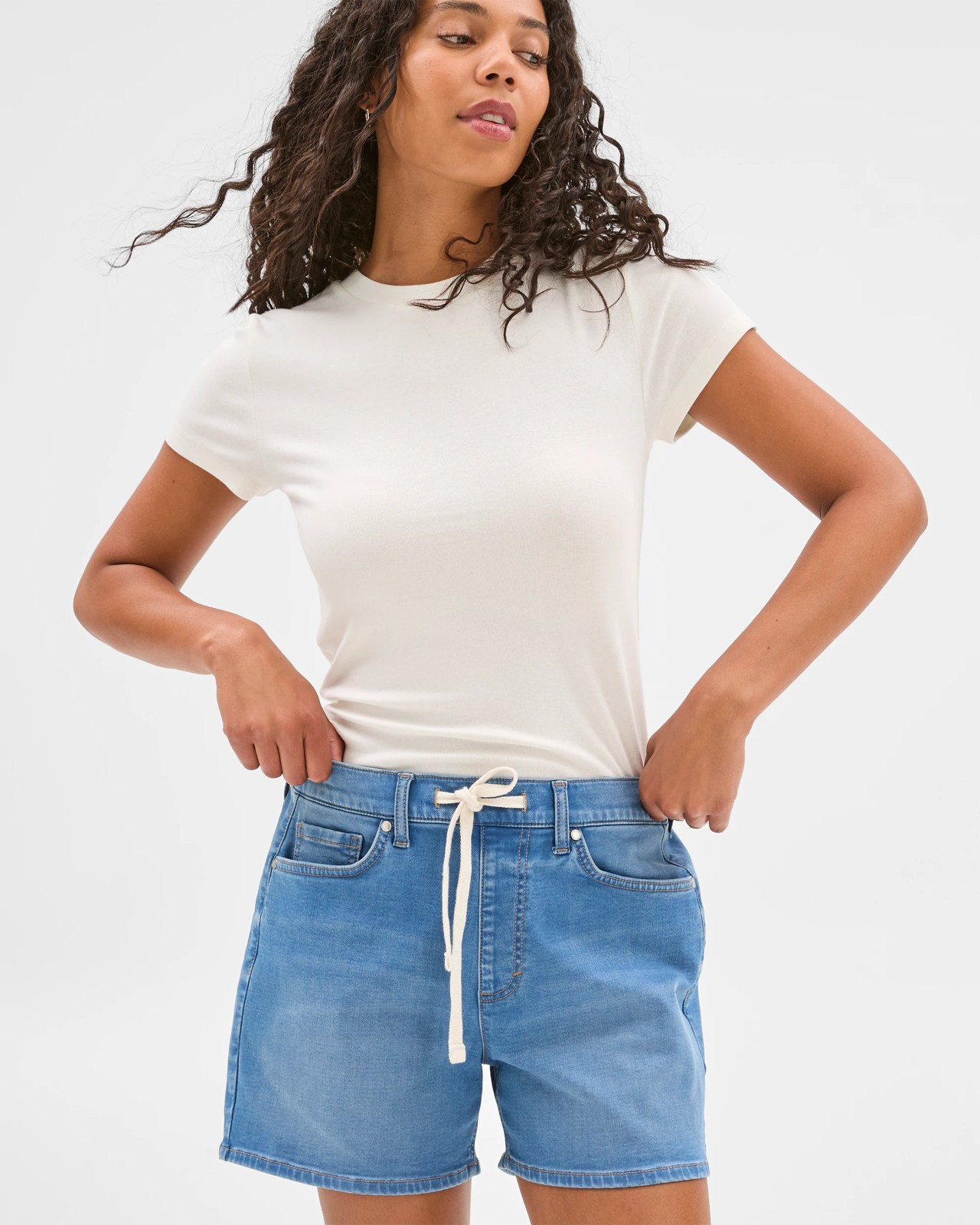 Step out with ease this season in these charming tie waist knit denim shorts. Featuring a wonderfully soft material with just the right touch of stretch, these shorts allow you to move freely while feeling fabulous. The adjustable drawstring and elasticated waistband offer a comfortable fit, making them perfect for everything from a relaxed afternoon at home to catching up with friends. Finished with a timeless five-pocket touch and a classic short length, they will effortlessly lift your casual wardrobe. Try them on for yourself—you'll love how effortlessly stylish and comfortable your day feels.