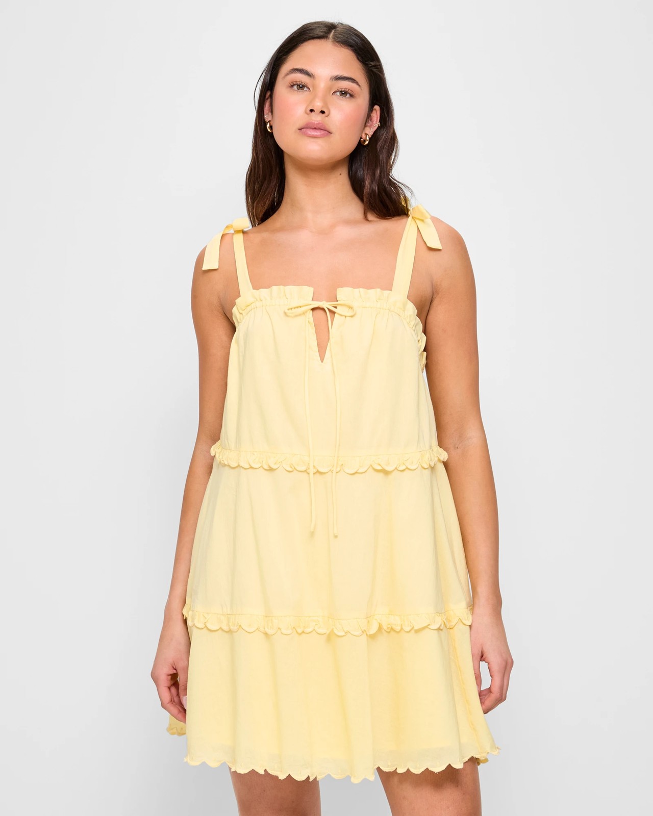 Step into summer with the Tiered Frill Mini Dress from Lily Loves. This charming dress, made of soft cotton, offers a light and flowy feel perfect for warm days. The banana yellow hue adds a vibrant touch, while the sweetheart elastic neckline with an upper frill and tie centre creates a lovely, feminine shape. Thick tie top shoulder straps provide comfortable support, and the tiered panels with ruffled edges give it a playful flair. With its mini length and scalloped hemline, it's a delightful choice for any casual outing. Pull it on and enjoy the chic, effortless style! Available in size 8.