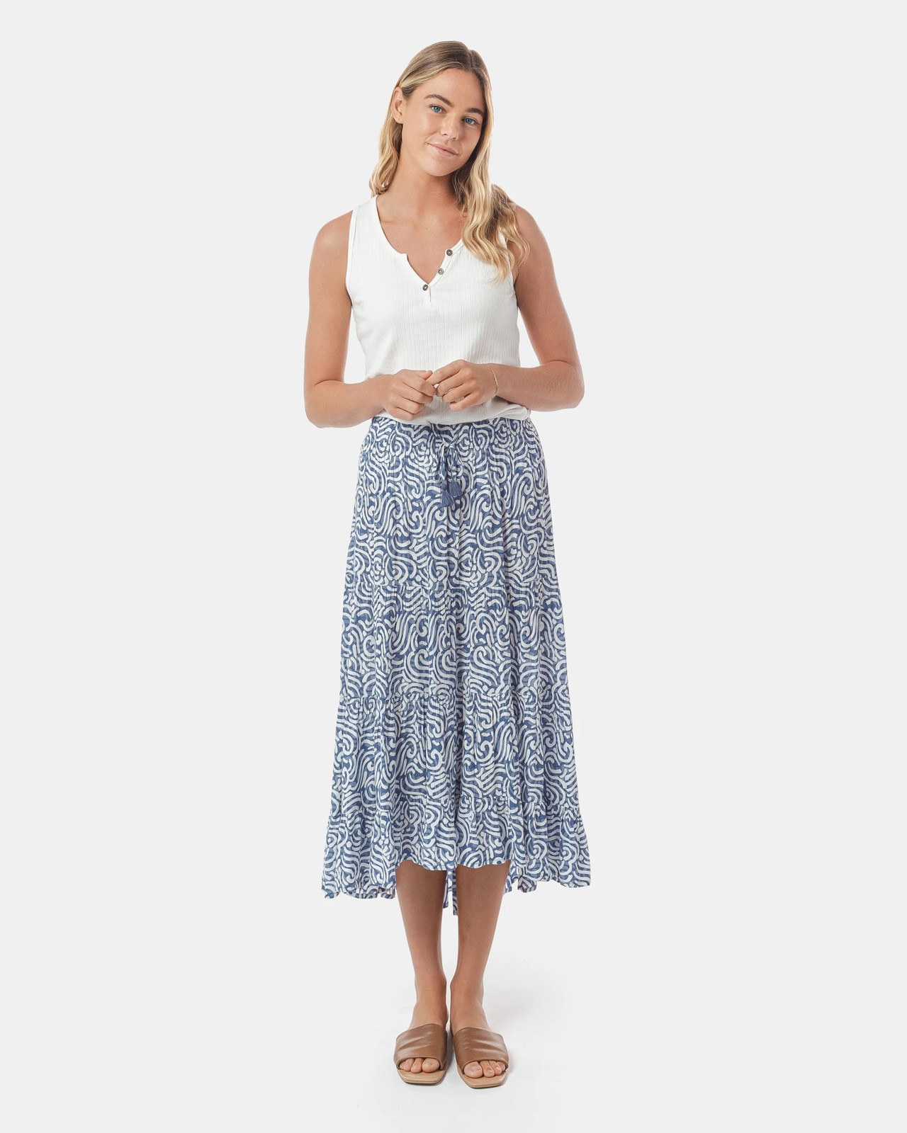 These Piping Hot tiered skirt is a flattering and easy wear all season. For a lightweight skirt perfect for lounging or a day at the beach or going out with friends and family. Relax in style with an elasticated waist and a fresh summer blue swirl print.