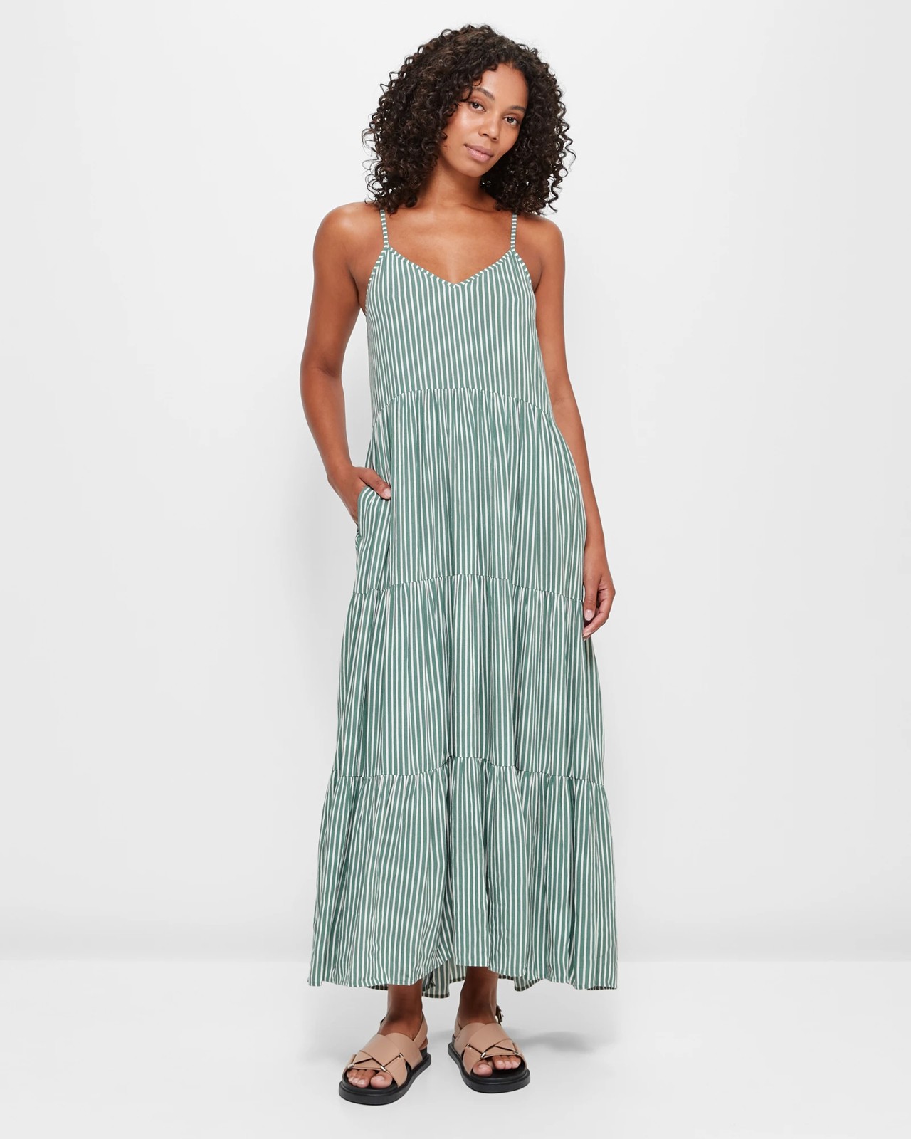 Get ready to turn heads in this stunning Tiered Strappy Dress. Made from a lightweight viscose fabric, this dress features a flattering V-neckline and thin adjustable shoulder straps for a perfect fit. The structured waist and tiered panels create a beautiful silhouette, while the side seam pockets add functionality. This dress is designed in a sagebrush green and white stripe pattern, perfect for a summer day or a special occasion. With its maxi length and straight hemline, this dress exudes elegance. Step out in style with this must-have dress and be the centre of attention wherever you go.