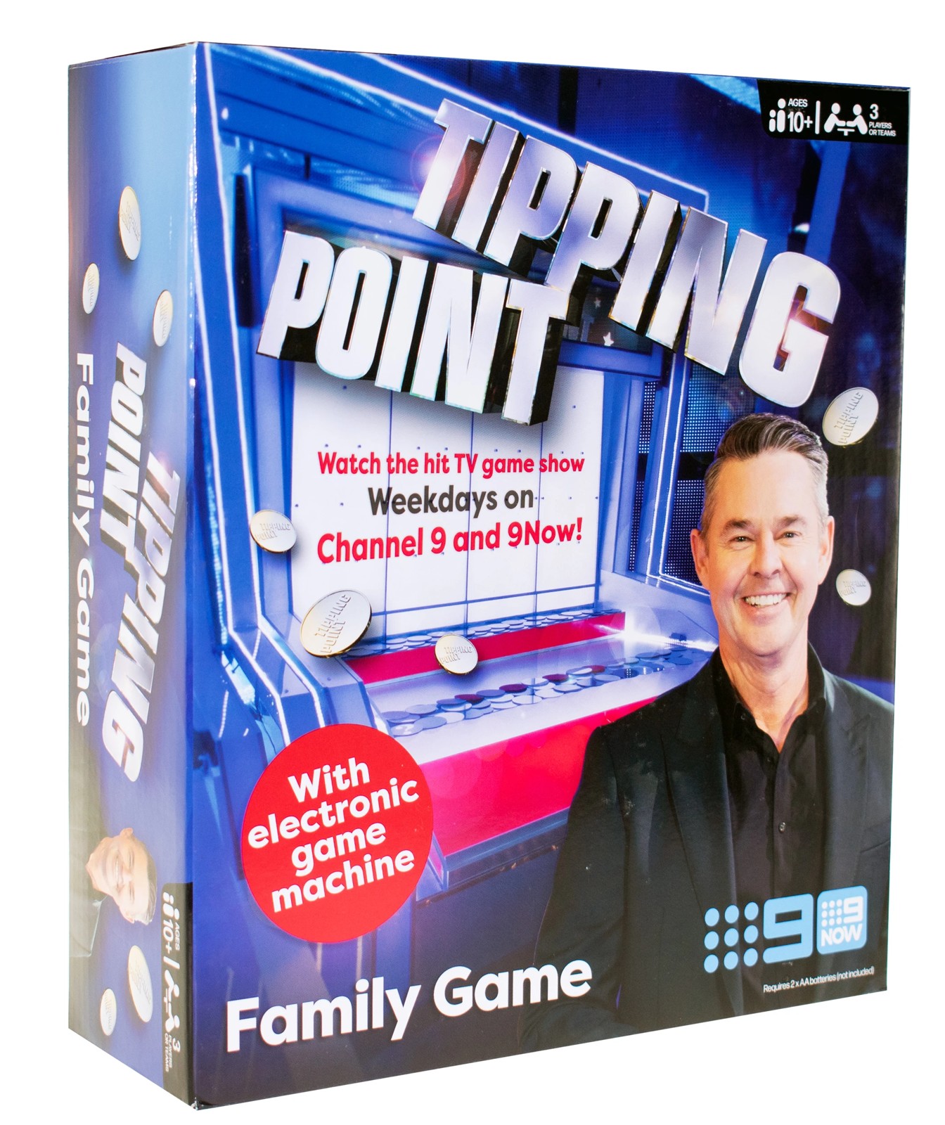 Tipping Point is the high stakes quiz game the whole family can enjoy. Based on the highly popular TV game show, Tipping Point combines general knowledge questions and answers with nail-biting unpredictability. Compete as teams or individuals, answer questions correctly, win tokens to drop into the table-top electronic Tipping Point machine. Which of the four drop zones do you think will give you the biggest payout? As the machine slides back and forth, let your token fall and see whether that will get a surfer, a rider or a boomerang drop. One single correct answer could trigger a cashcade that changes everything! Which team can amass the most tokens to go forward and compete in the final jackpot round? It's anyone's game! Suitable for 3 players or teams aged 10 and up.